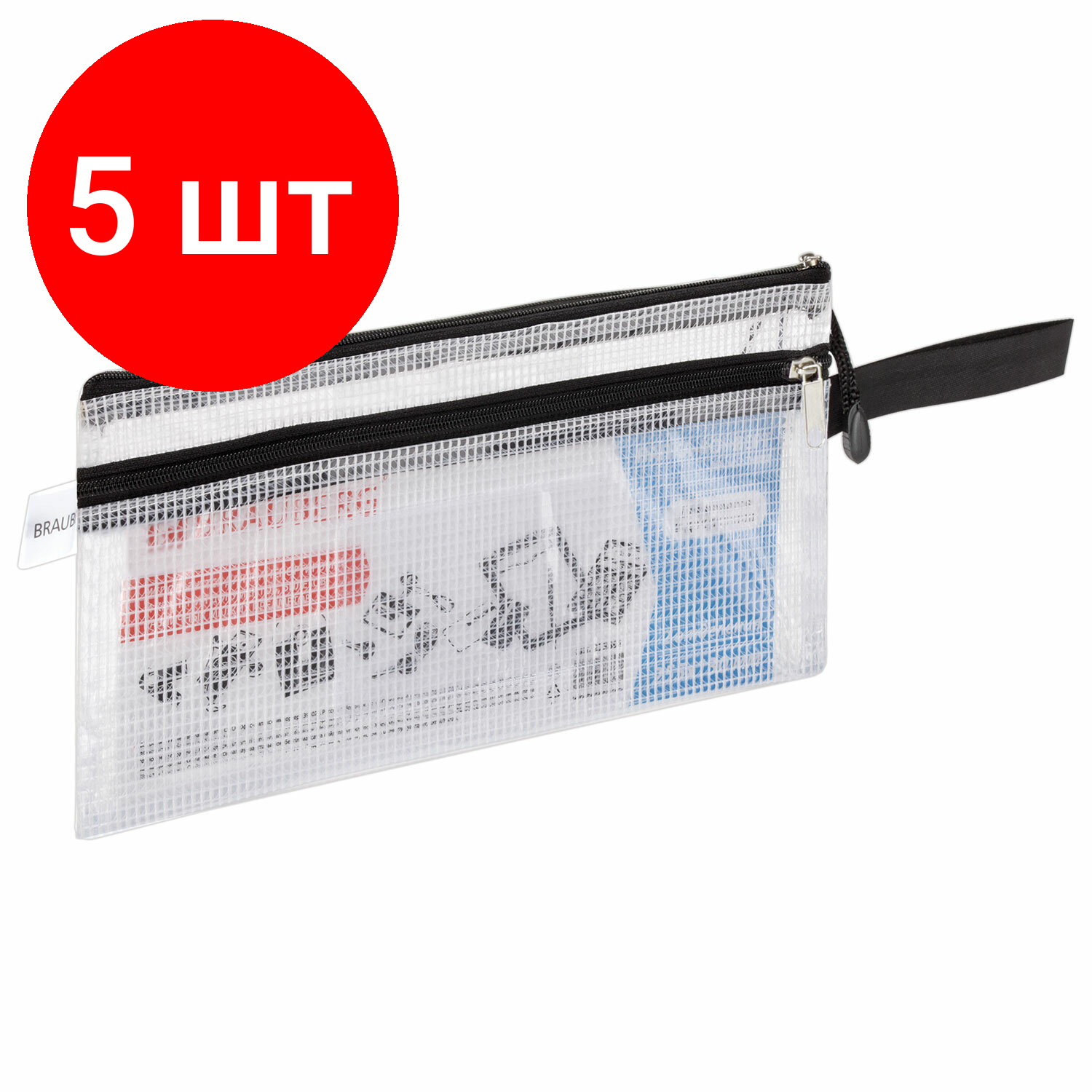 Купить Комплект 5 шт, Папка-конверт на молнии малого формата (255х130 мм), 2 отдел, ПВХ, прозрачная, 0.3 мм, BRAUBERG "Solid", 223891