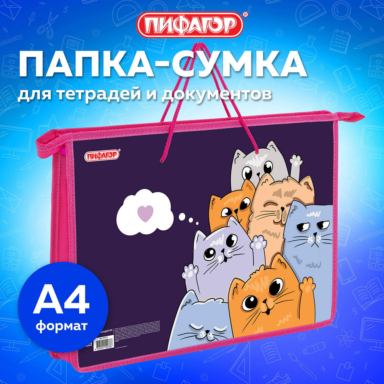 Купить Папка на молнии с ручками Пифагор А4, 1 отделение, пластик, ручки-шнурок, Cats greetings, 272111