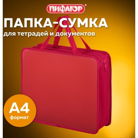 Купить Папка на молнии с ручками пифагор, А4, пластик, молния сверху, однотонная красная, 228232