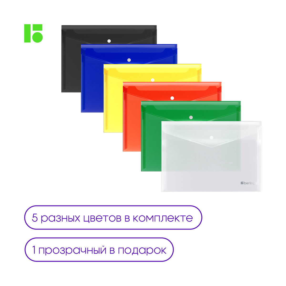 Папка-конверт на кнопке Berlingo "No Secret", А5+, 200мкм, ассорти, 5 шт. в упаковке
