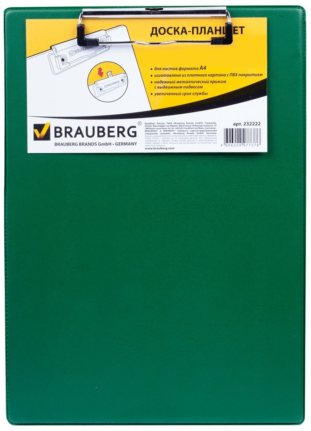 Планшет BRAUBERG "NUMBER ONE" с прижимом А4 (228х318 мм),картон/ПВХ, зеленая, 232222