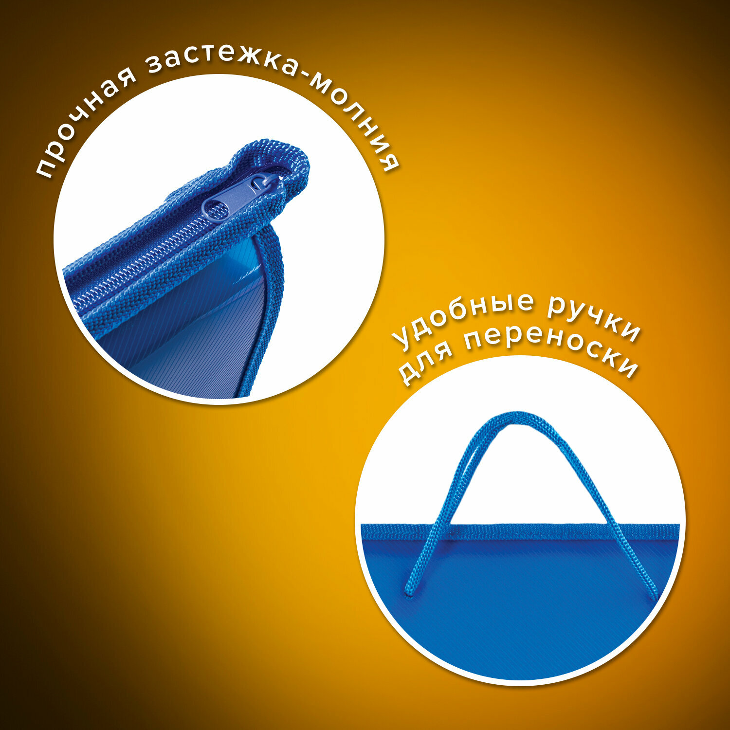 Папка на молнии с ручками пифагор, А4, 1 отделение, пластик, 55 мм, молния сверху, однотонная синяя, 228235