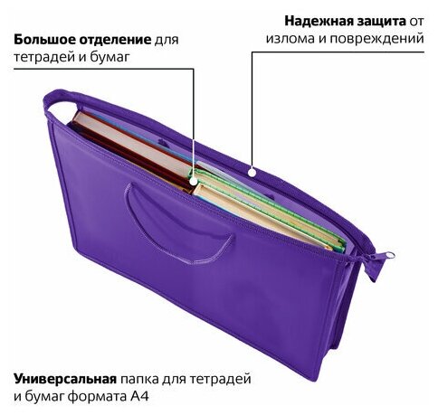 Папка на молнии с ручками пифагор, А4, пластик, молния сверху, однотонная фиолетовая, 228237