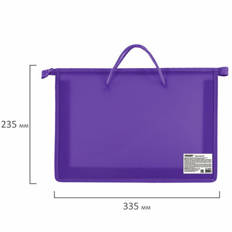 Папка на молнии с ручками пифагор, А4, пластик, молния сверху, однотонная фиолетовая, 228237