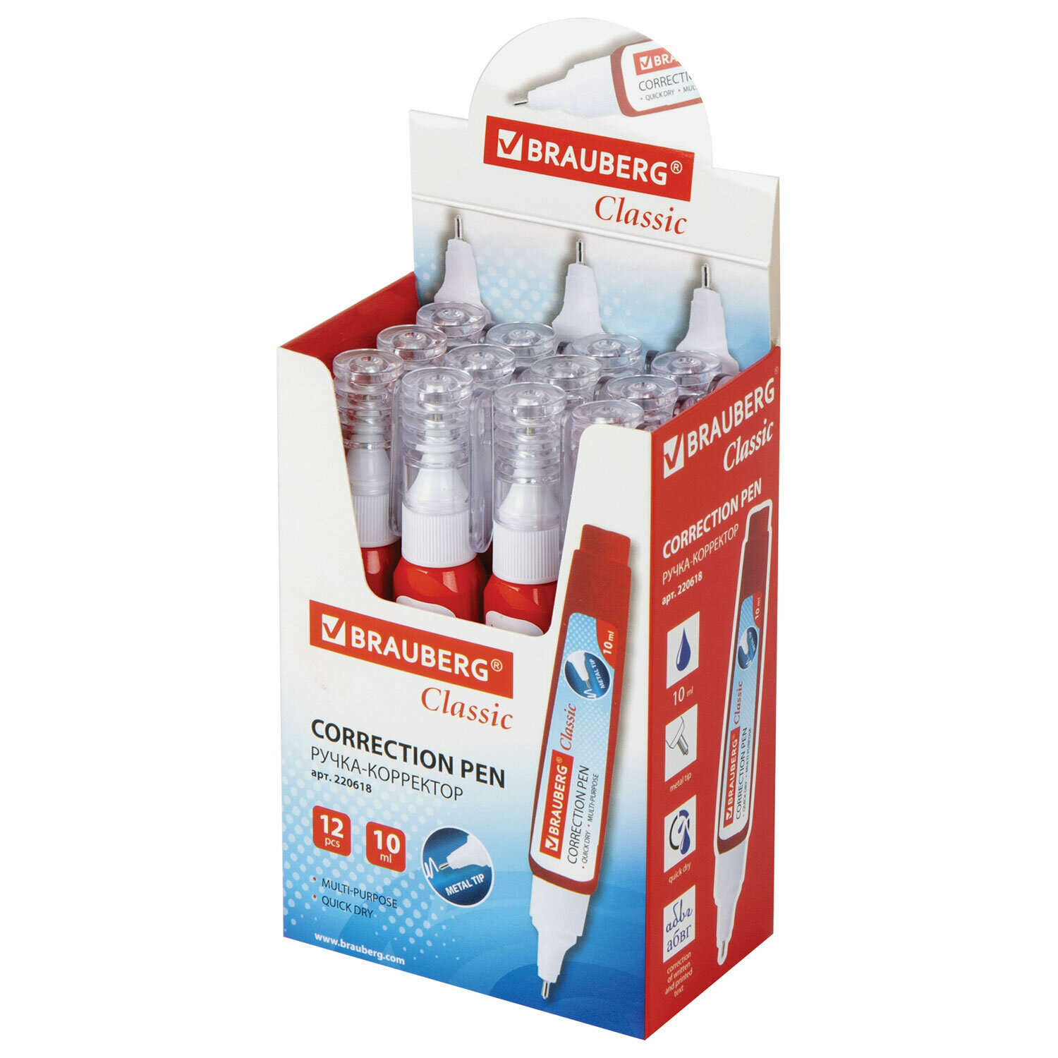 Купить Корректор канцелярский для школы жидкий ручка, штрих, замазка, жидкость 10 мл, металлический наконечник, Brauberg, 220618
