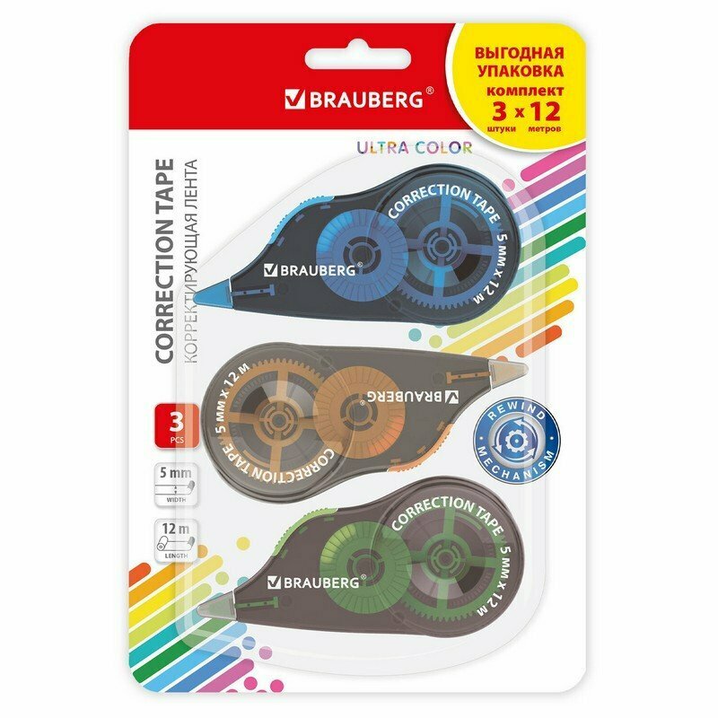 Корректирующая лента Brauberg ULTRA COLOR, 5 мм x 12 м, механизм перемотки, выгодная упаковка 3 штуки в блистере, 271253