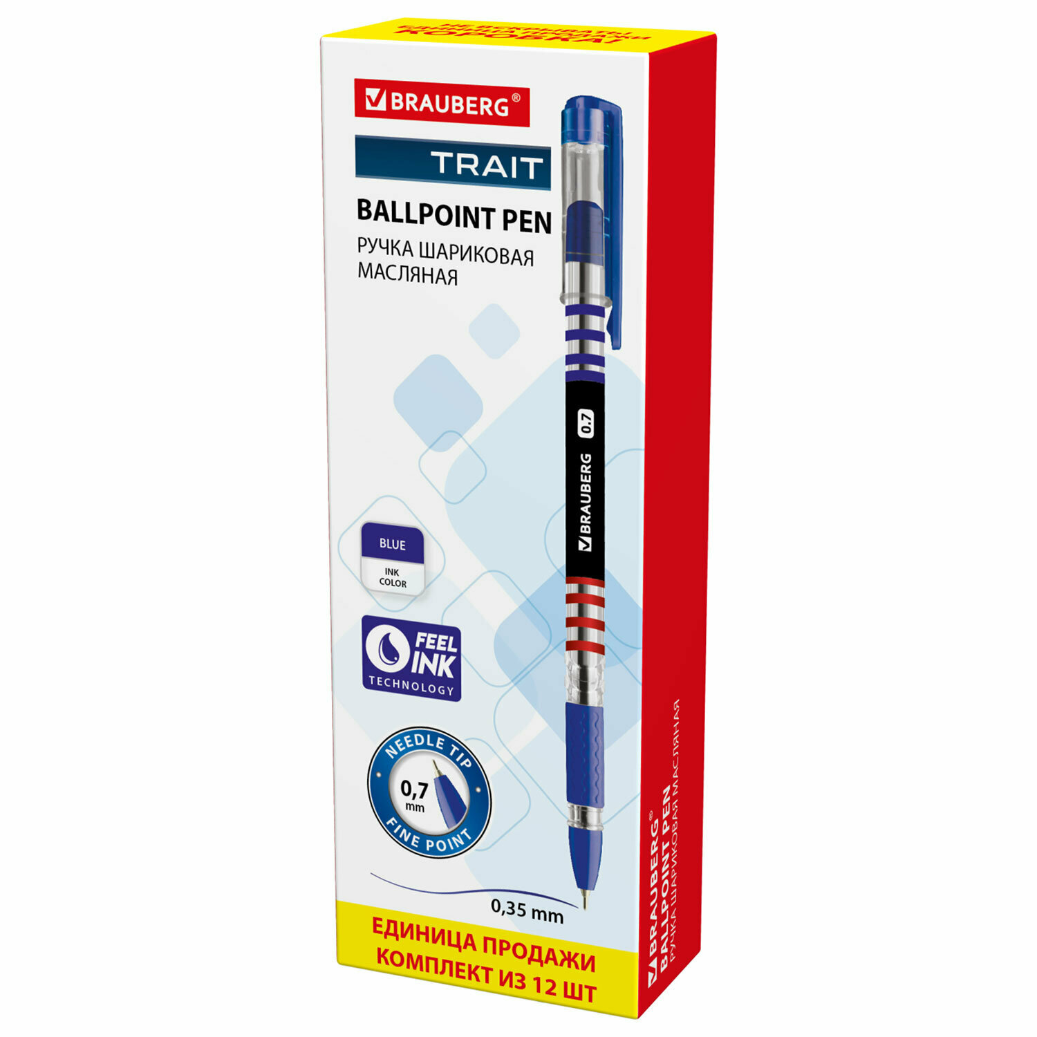 Ручка шариковая масляная с грипом BRAUBERG Trait, комплект 12 штук, синяя, узел 0,7 мм, 880184