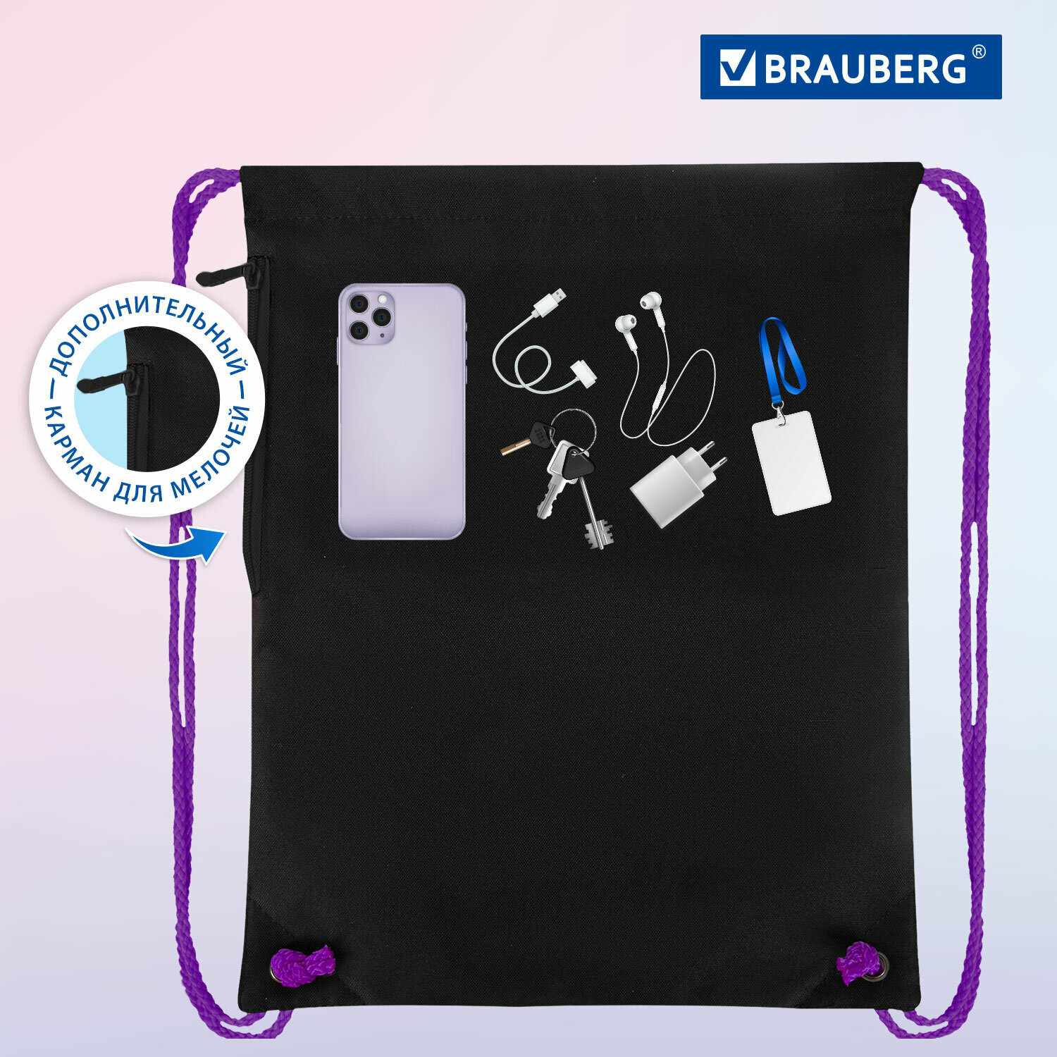 Мешок для обуви Brauberg Premium, карман, подкладка, светоотражайка, 43х33 см, Space sweets, 272422