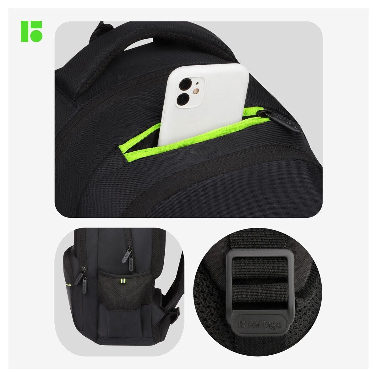 Рюкзак Berlingo U3 "Black-green" 41*29,5*13см, 2 отделения, 4 кармана, эргономичная спинка