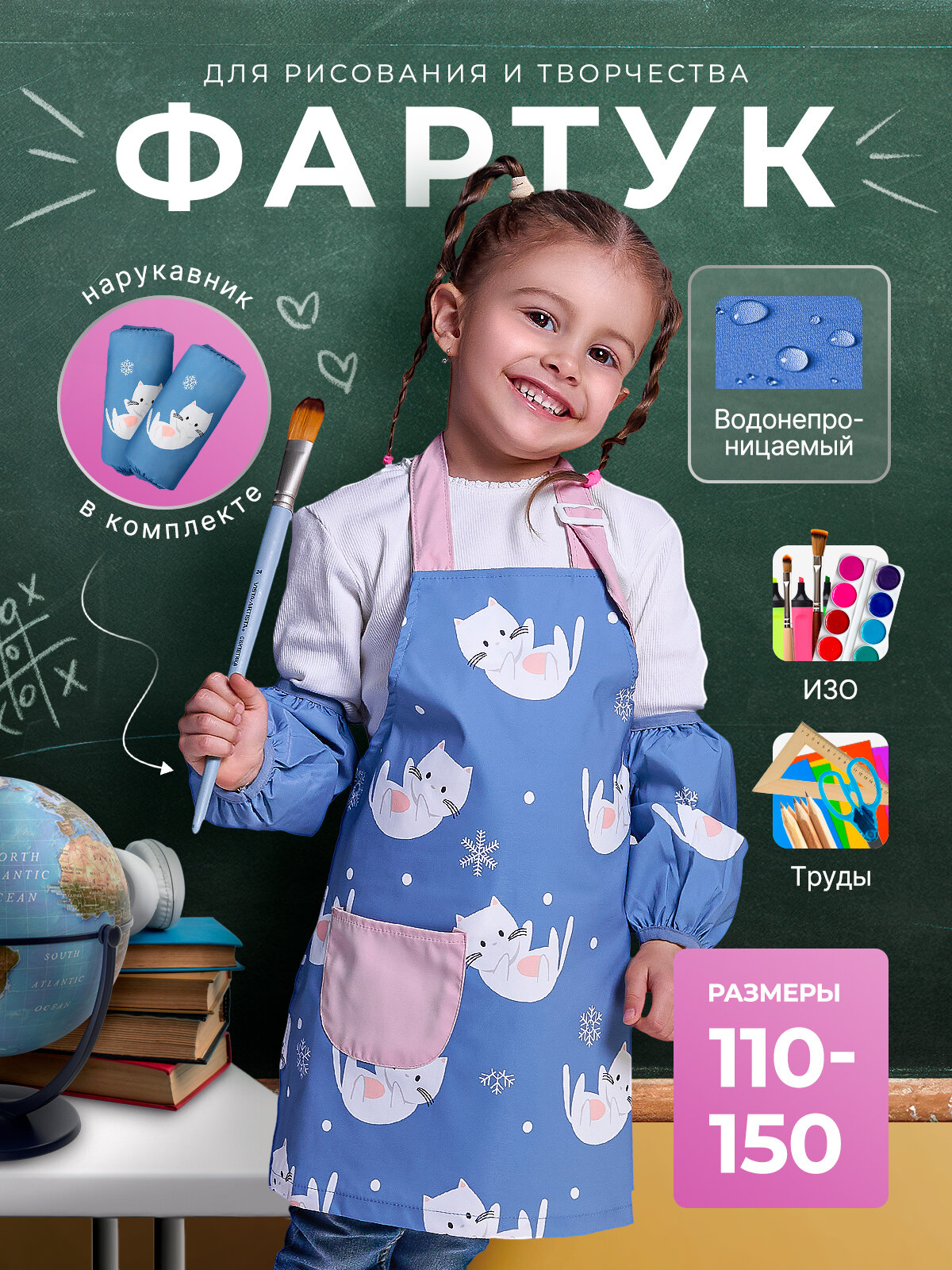 Фартук детский с нарукавниками для рисования и творчества, художественный фартук для труда с карманом, размер L, голубой с котиками