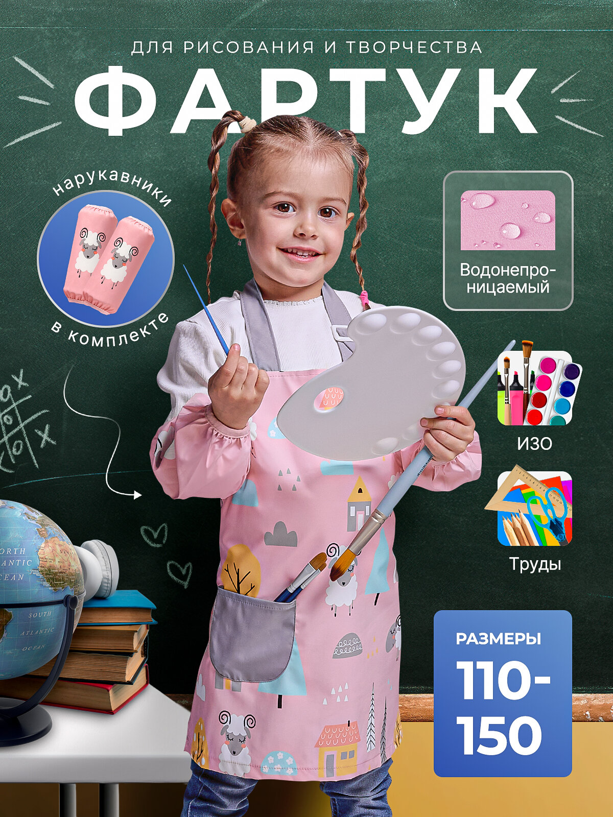 Фартук детский с нарукавниками для рисования и творчества, художественный фартук для труда с карманом, размер L, розовый с овечкой
