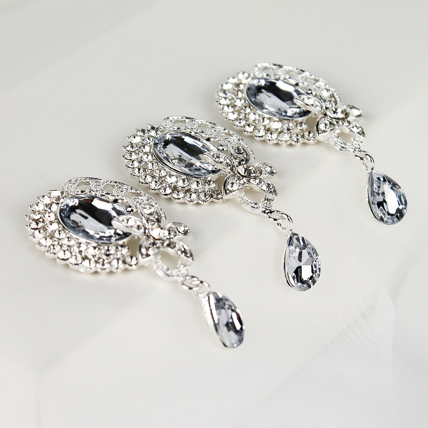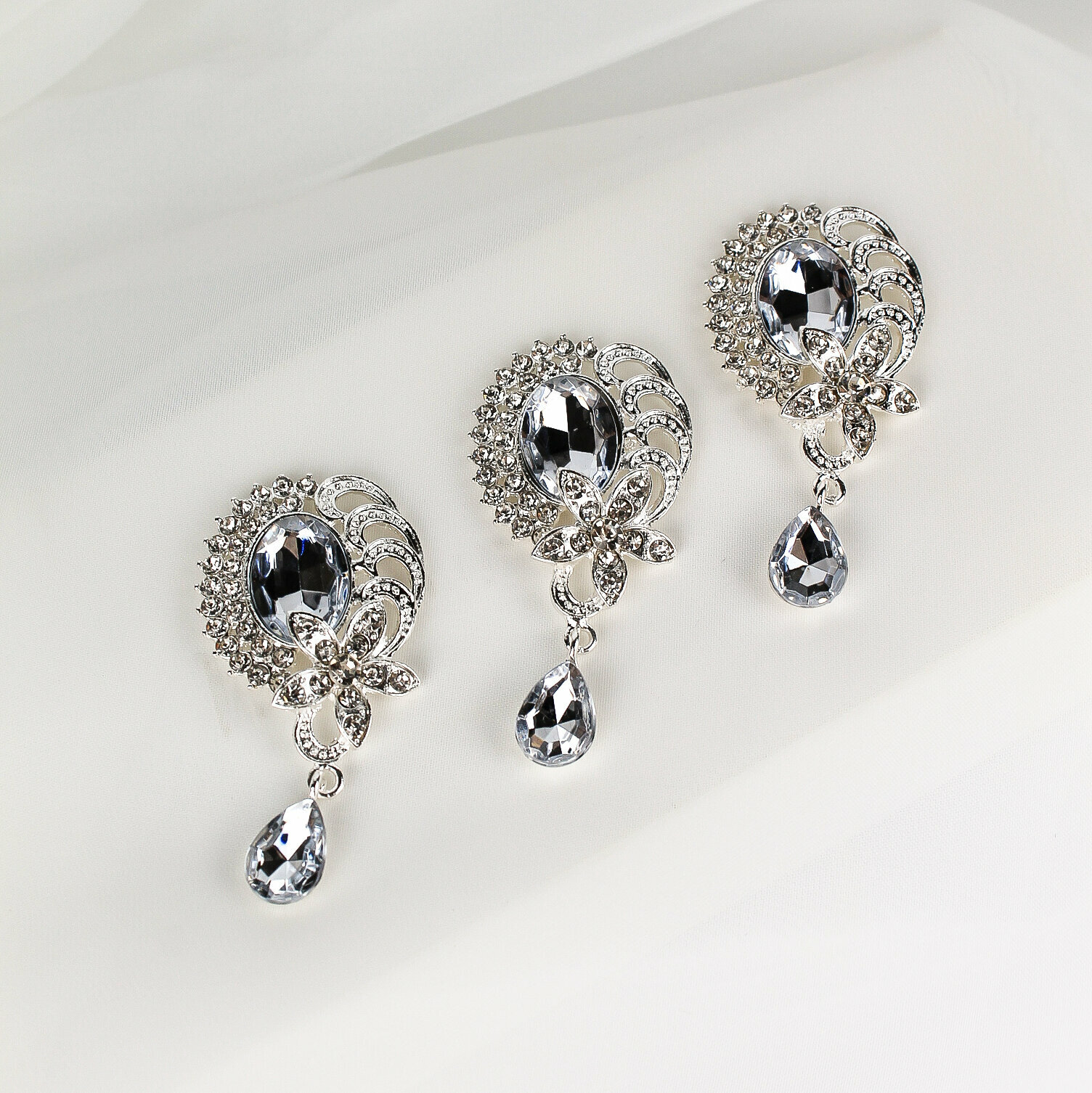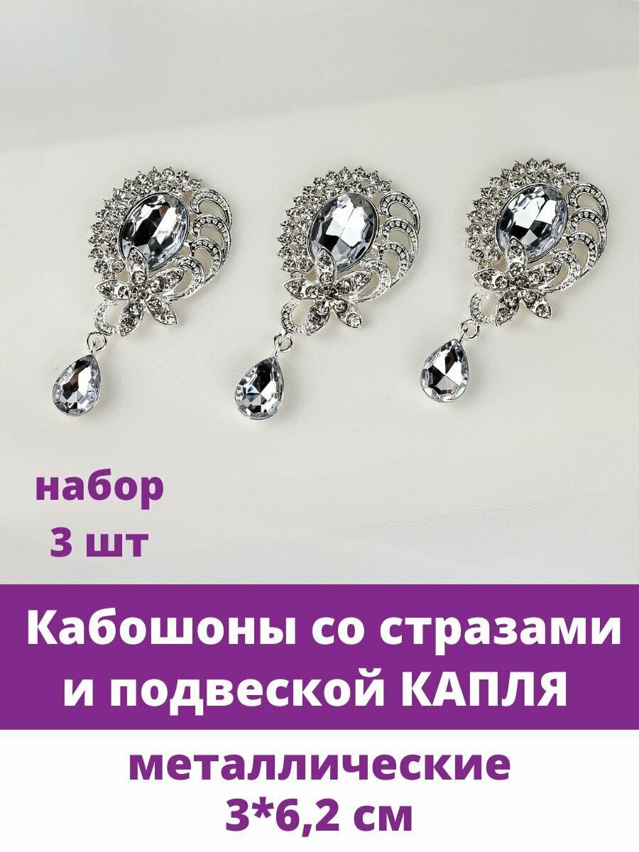 Купить Кабошон - украшение со стразами и подвеской капля, прозрачный/серебро, 30*62 мм, металлическое, 3 шт.