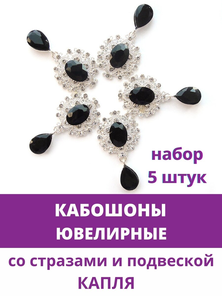 Купить Кабошоны ювелирные со стразами и подвеской капля, черные/серебро, набор 5 шт.