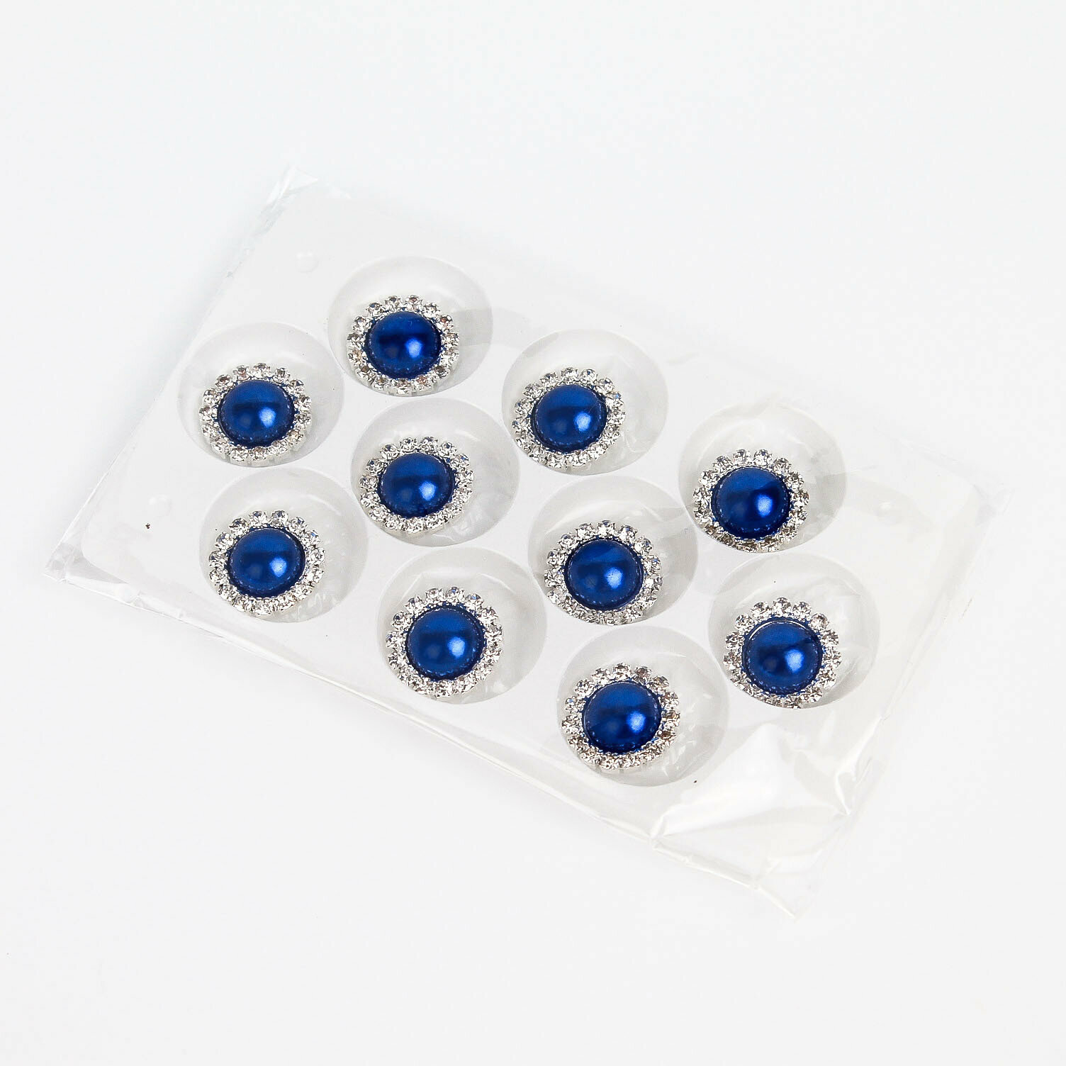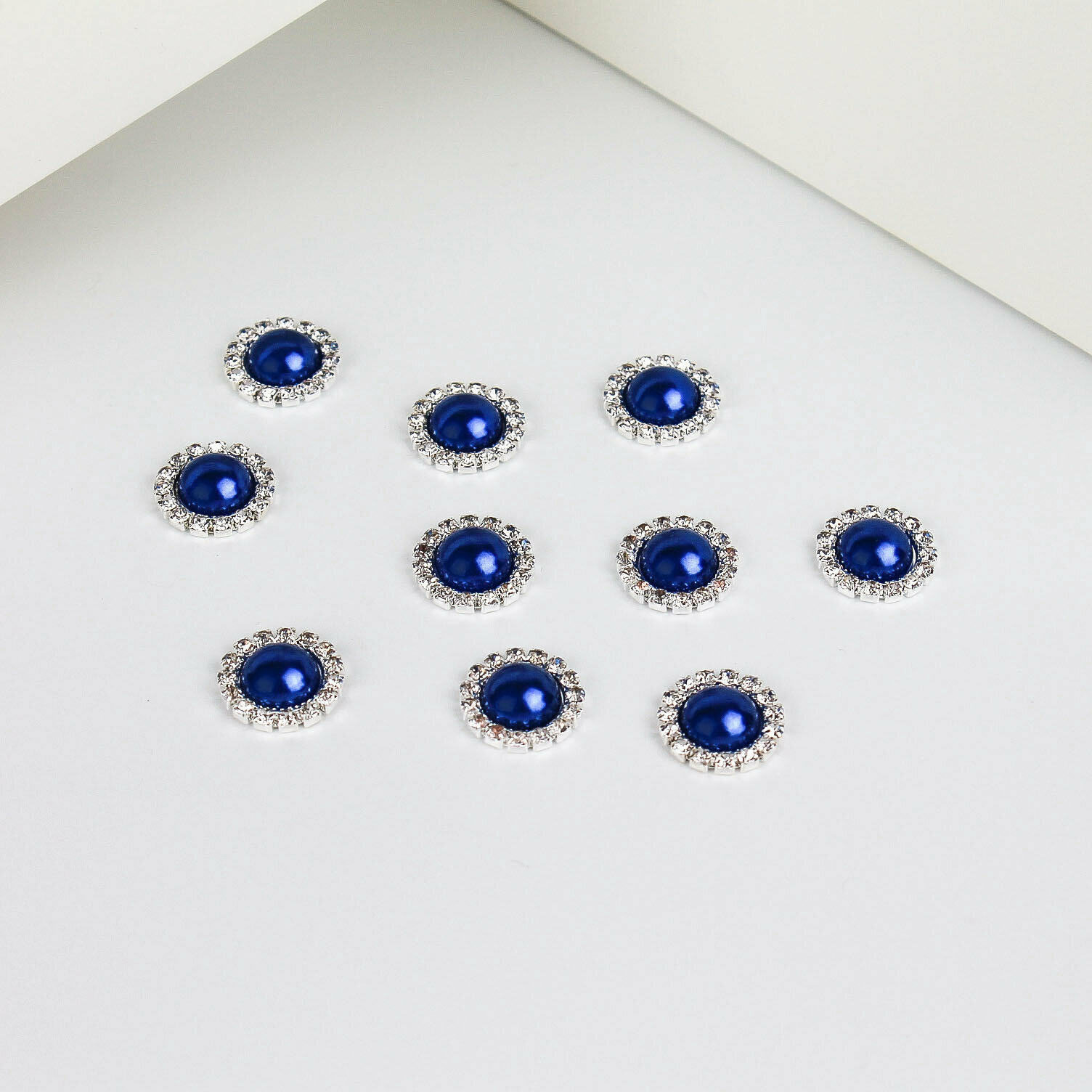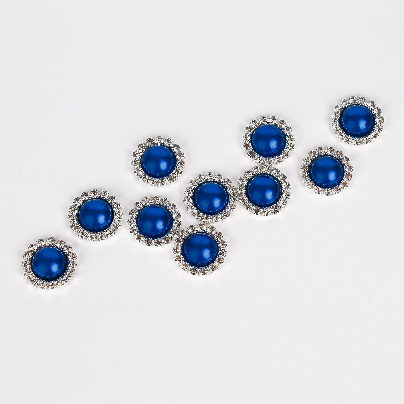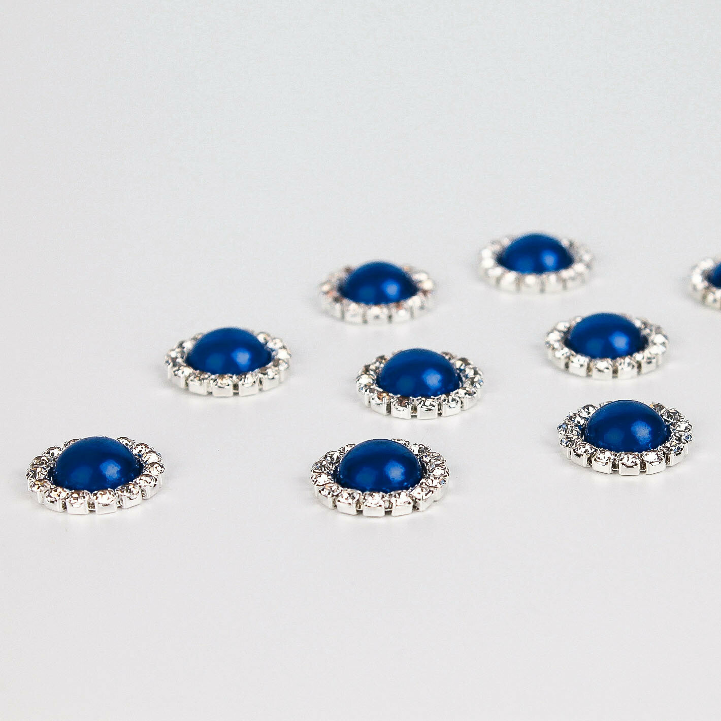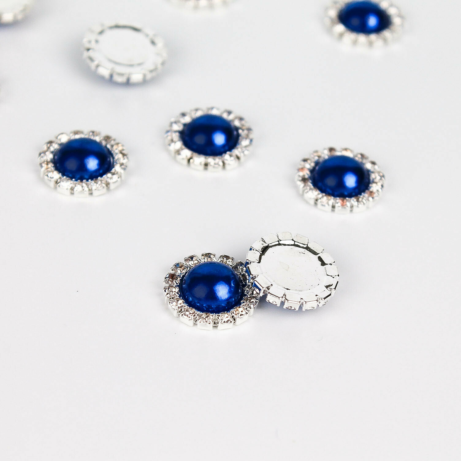 Купить Кабошон - украшение со стразами и жемчужиной круглое, цвет синий жемчужный, 1,5 см, металлическое, 10 шт.