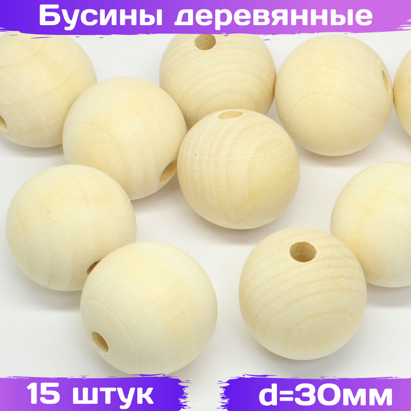 Купить Бусины деревянные круглые без покрытия "Керри", цвет бежевый, диаметр около 30 мм, 15 шт, ВсемБусики