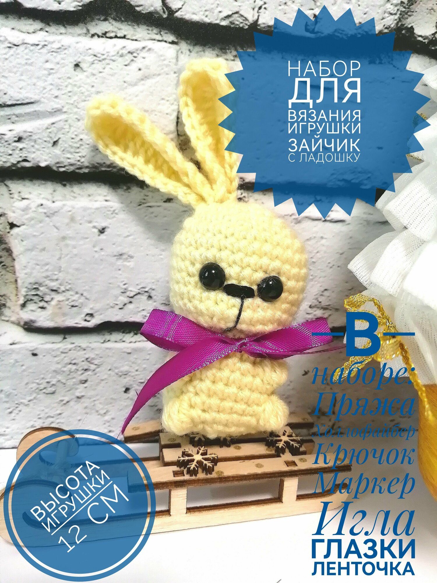 | Подробная комплектация | В комплекте : Пряжа 2 цветов Холлофайбер Крючок Маркер Игла Фурнитура для брелка Инструкция |