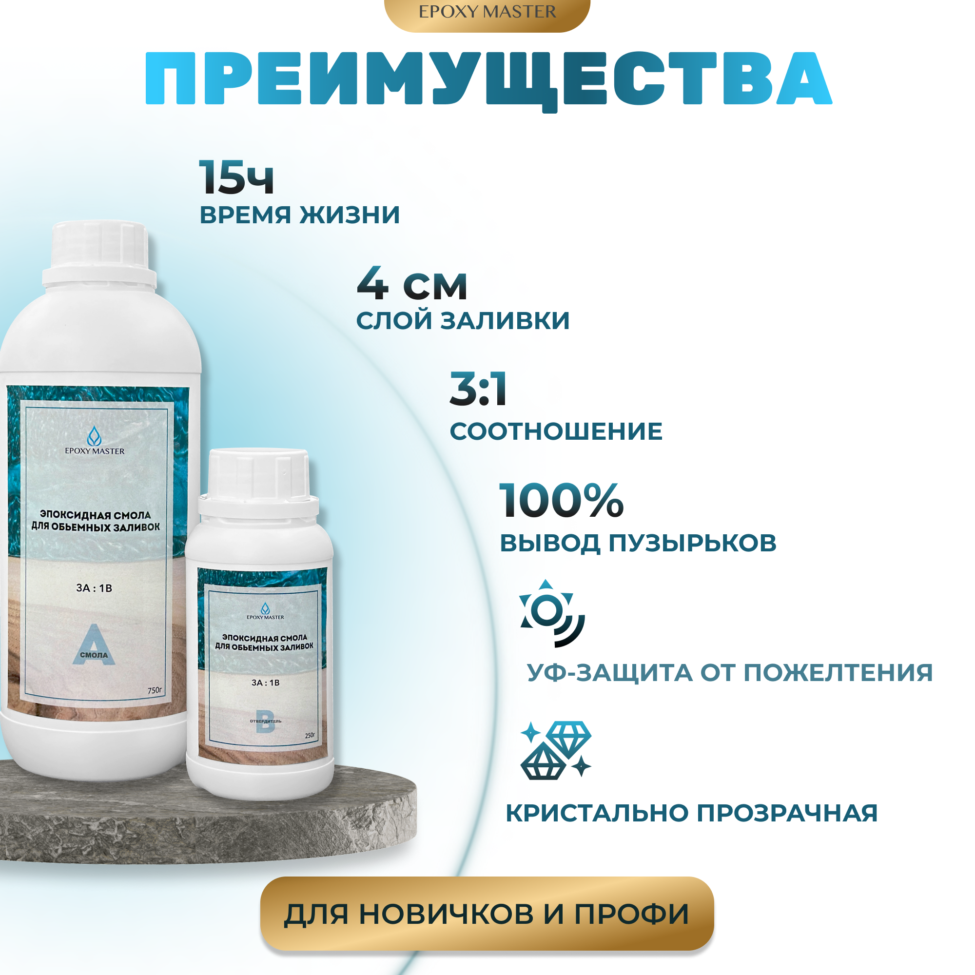 Ниже Вы можете прочитать отзывы на Эпоксидная смола для объемных заливок EpoхyMaster (1кг), ознакомится с подробными характеристиками, посмотреть интересные обзоры и фотографии на Эпоксидная смола для объемных заливок EpoхyMaster (1кг).