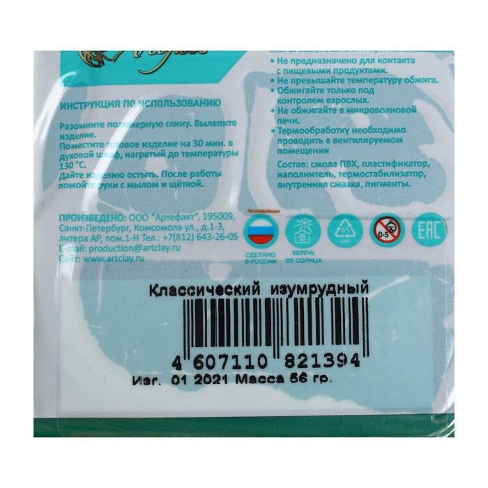 Полимерная глина запекаемая Артефакт Классическая, брус 50-56 г (151 классический изумрудный)