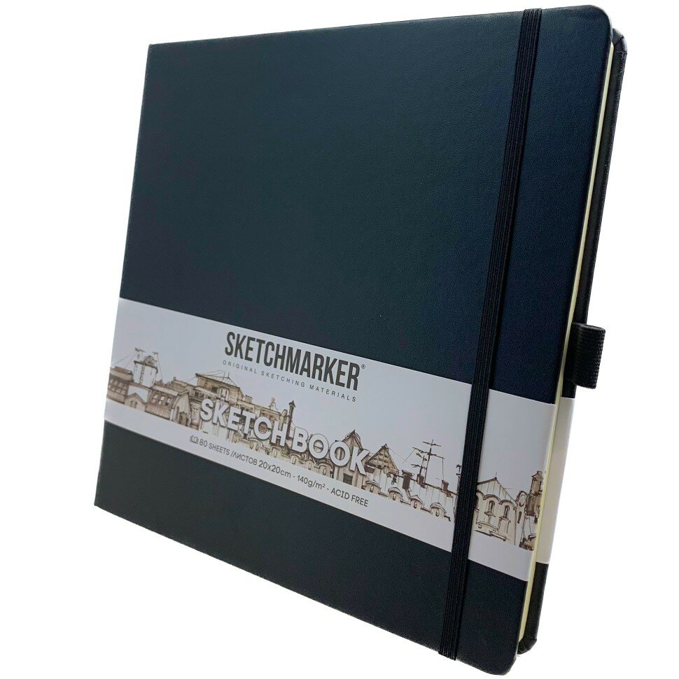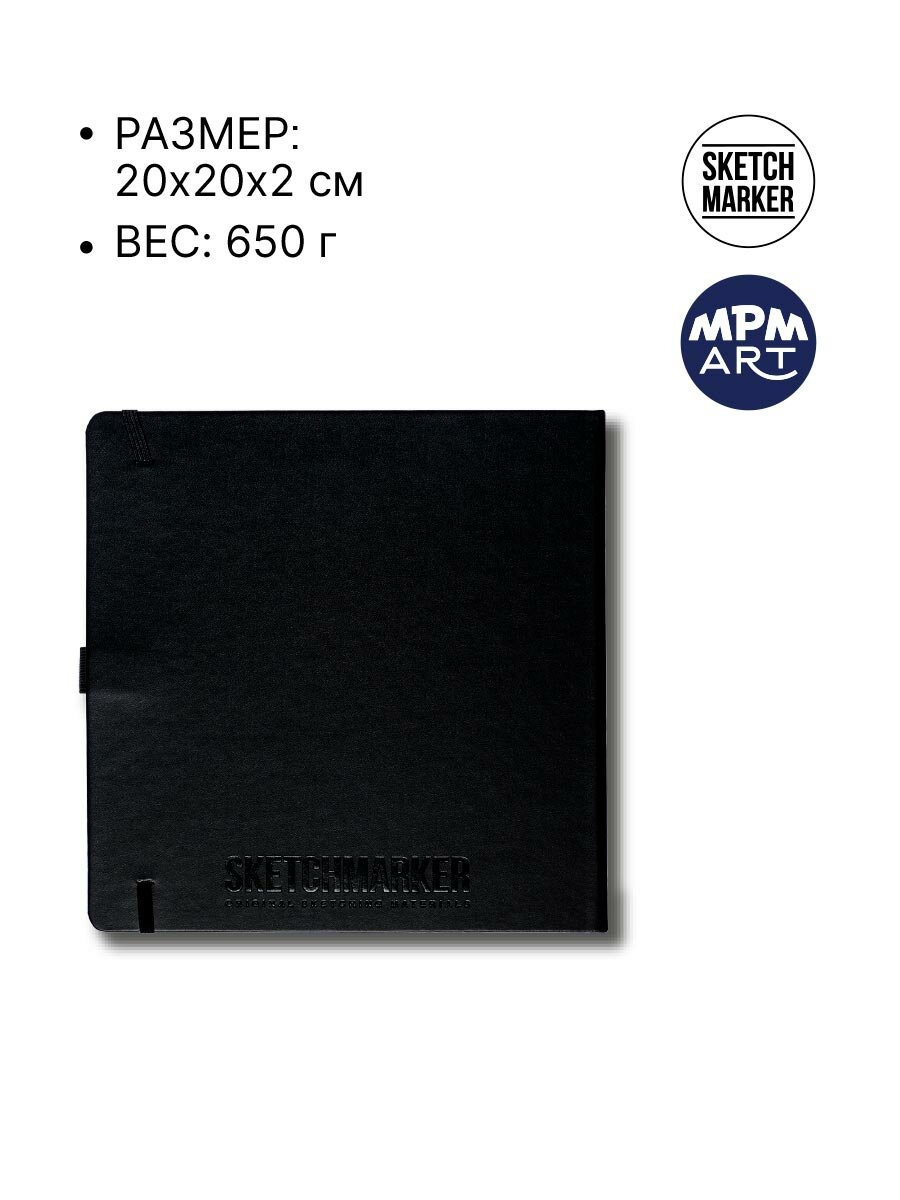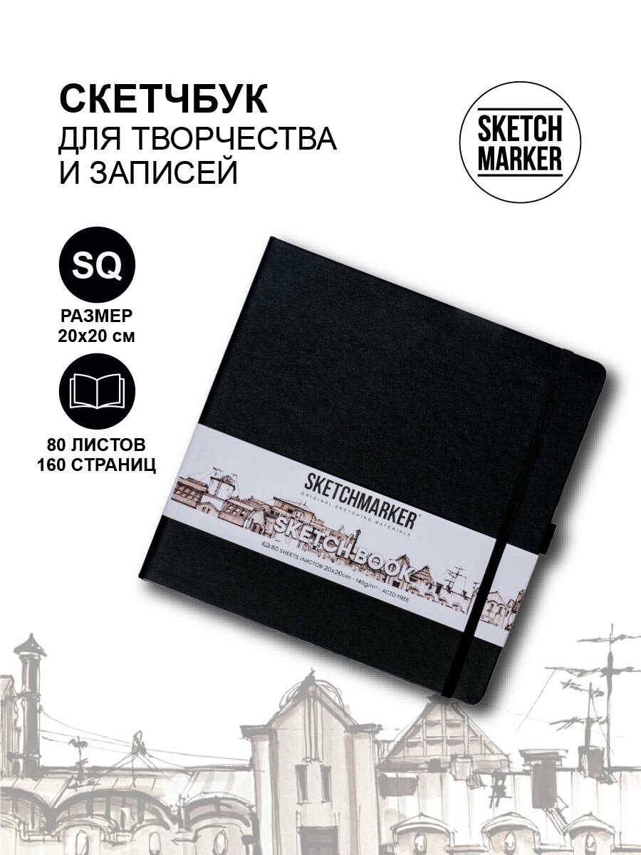 Скетчбук для рисования квадратный, блокнот для скетчинга SKETCHMARKER Sketchmarker 140г/кв. м 20*20cм 80л твердая обложка, цвет Черный