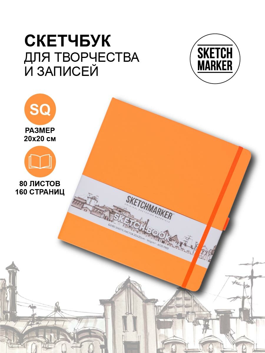 Скетчбук для рисования квадратный, блокнот для скетчинга SKETCHMARKER Sketchmarker 140г/кв. м 20*20cм 80л твердая обложка, цвет Оранжевый