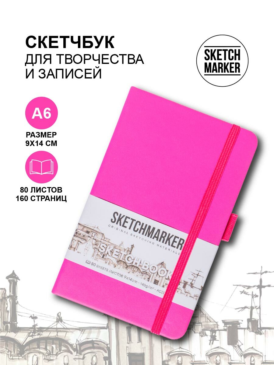 Скетчбук для рисования, блокнот для скетчинга SKETCHMARKER Sketchmarker 140г/кв. м 9*14см 80л твердая обложка, цвет Неоновая фуксия