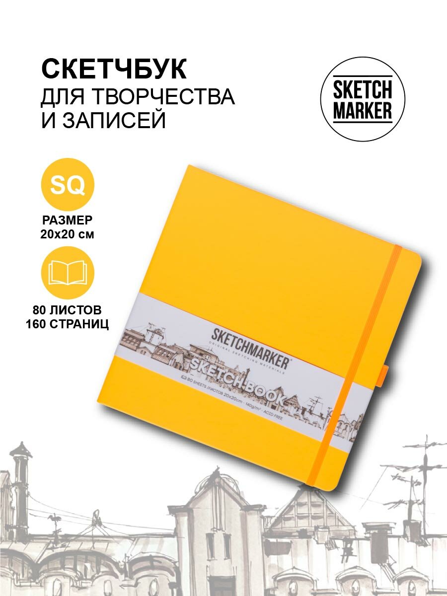 Скетчбук для рисования квадратный, блокнот для скетчинга SKETCHMARKER Sketchmarker 140г/кв.м 20*20cм 80л твердая обложка, цвет Лимонный