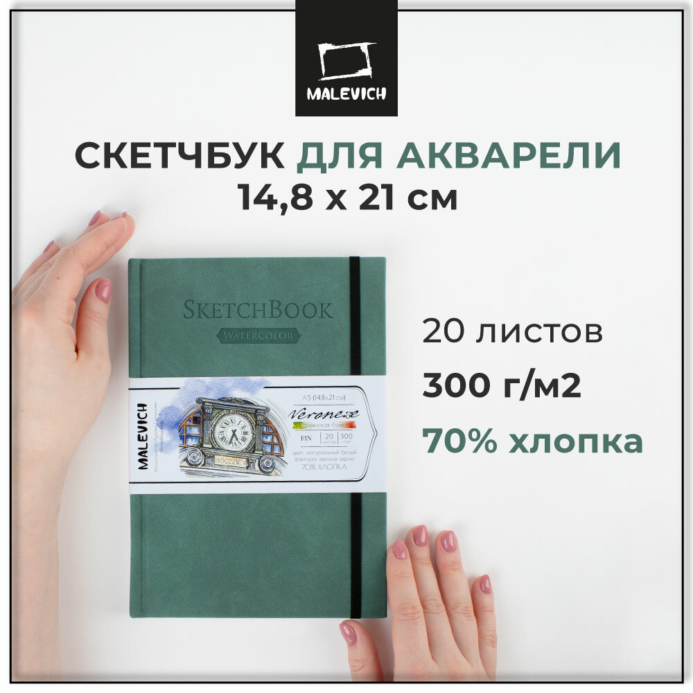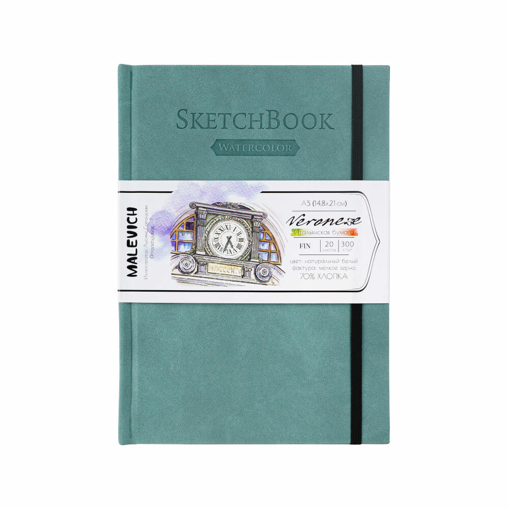 Скетчбук Малевичъ для акварели Veroneze, 70% хлопок 300 г/м, серо-зеленый, А5, 20л