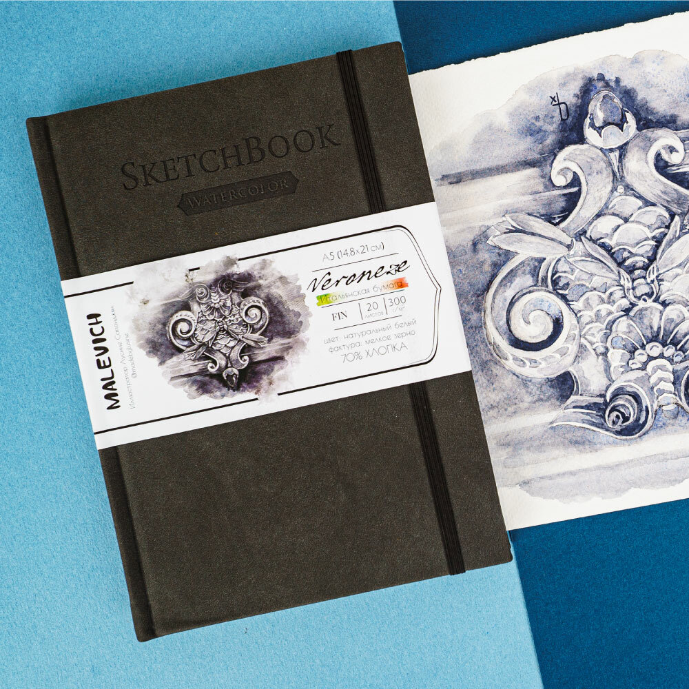 СохранитьСкетчбук Малевичъ для акварели Veroneze, 70% хлопок 300 г/м, черный, А5, 20л интересное: