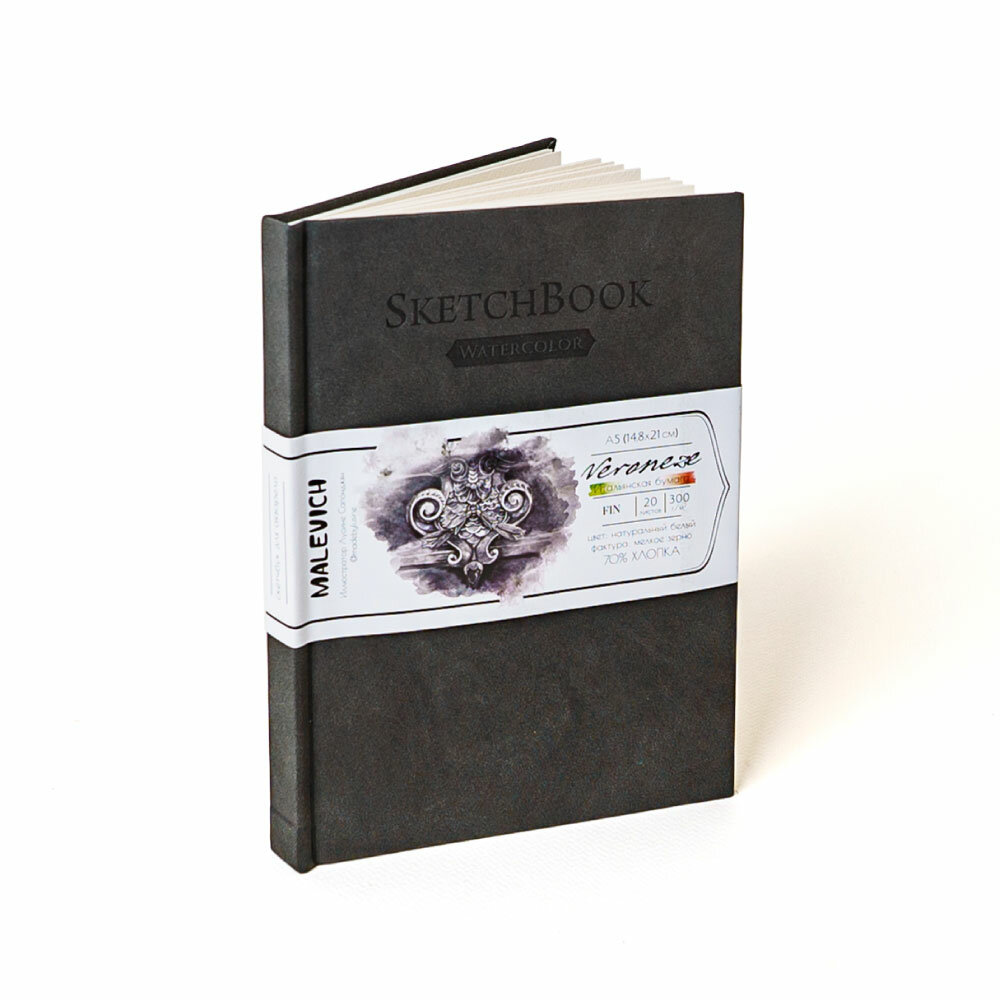 Скетчбук Малевичъ для акварели Veroneze, 70% хлопок 300 г/м, серый, А4, 20л