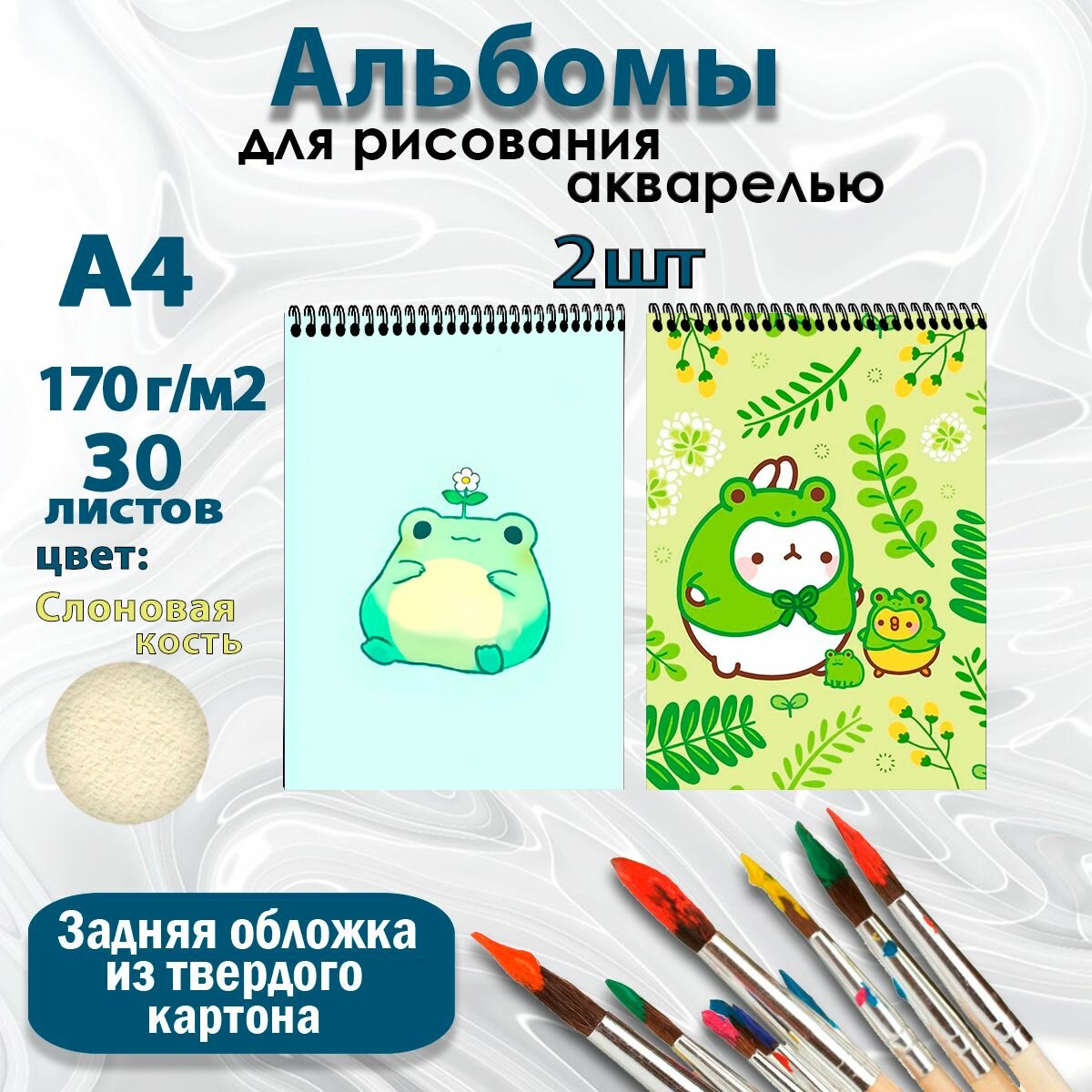 Альбом для акварели, для рисования А4 на жесткой подложке Лягушки, 30 листов цвета слоновая кость. Набор альбомов -2шт