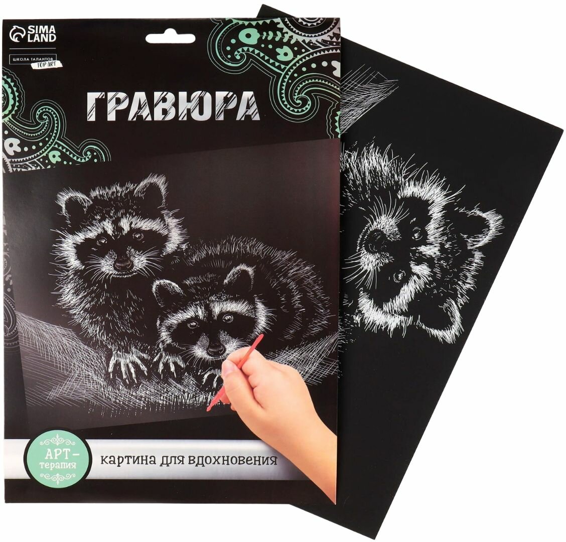 Купить Гравюра "Еноты" с металлическим эффектом А4 - серебро + штихель