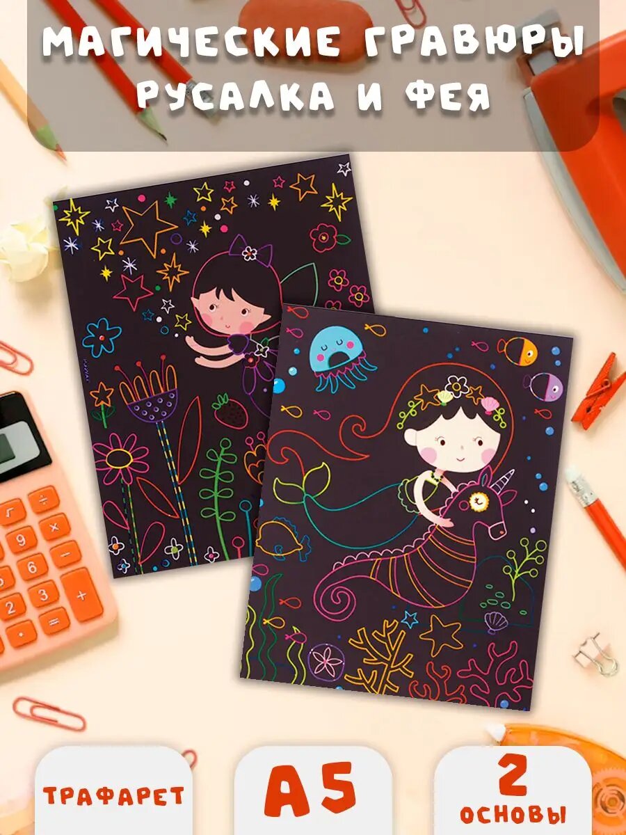 Гравюра магическая "Русалка и фея", А5, 2 основы в комплекте, с трафаретом, юнландия, 662691, в наборе 2 компл. интересное: