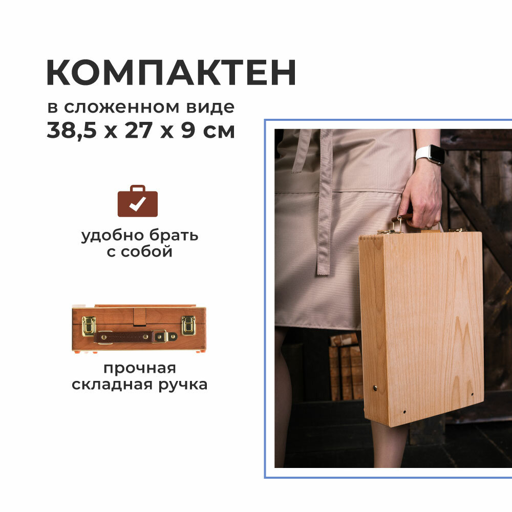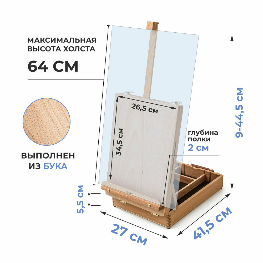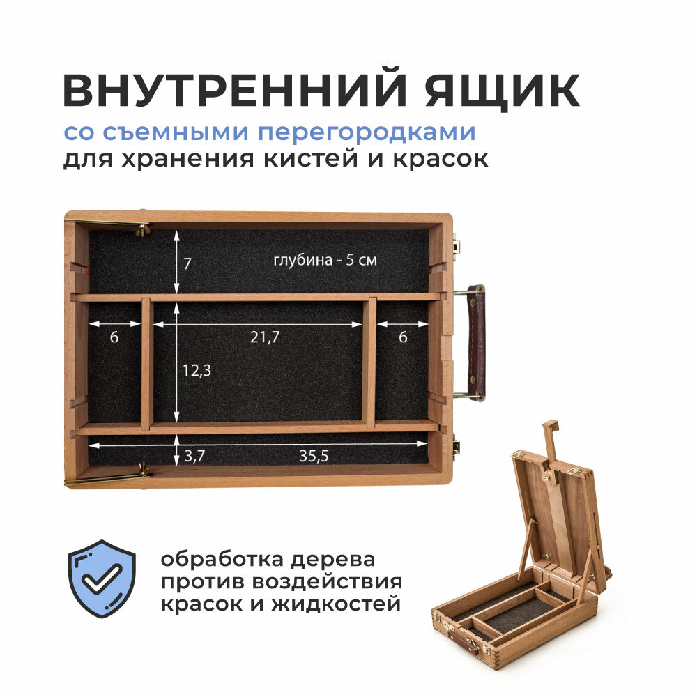 | Дополнительная информация | устойчив к влаге и коррозии, с регулируемой полкой для холста, с внутренним ящиком для красок и инструментов, с ручкой для переноски; габариты ящика - 26 х 37 х 9 см |