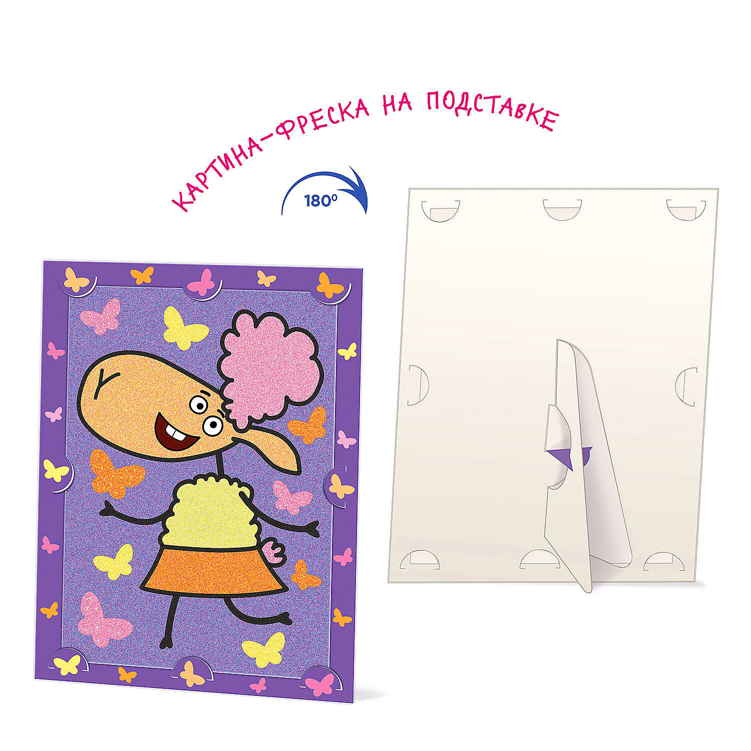 | Комплектация | цветной песок - 6 цветов, блёстки, цветные детали из самоклейки, самолеящаяся фон-основа, рамка-подставка, зубочистка, инструкция на упаковке |