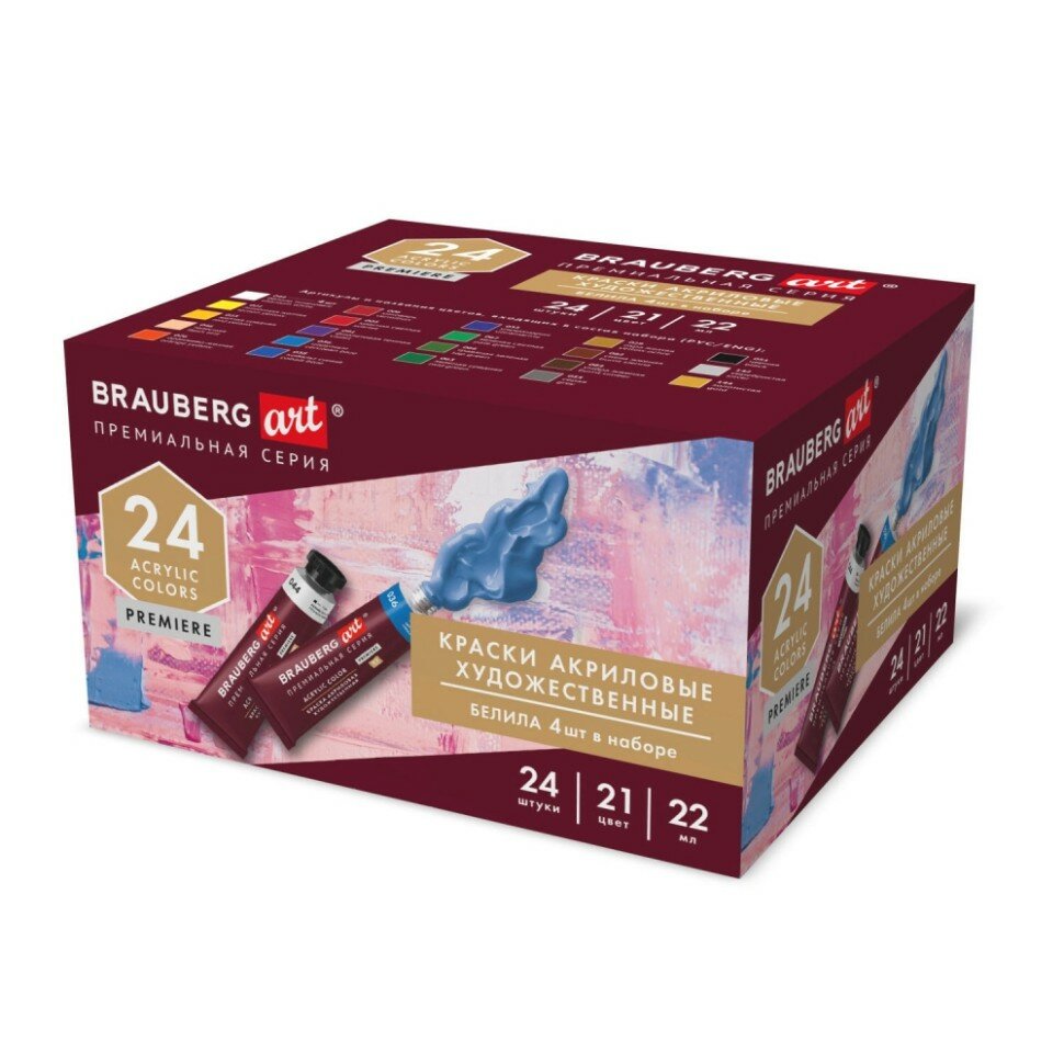 Краски акриловые художественные в тубах для рисования Brauberg Art Premiere, Набор 24 шт. по 22 мл, 191782