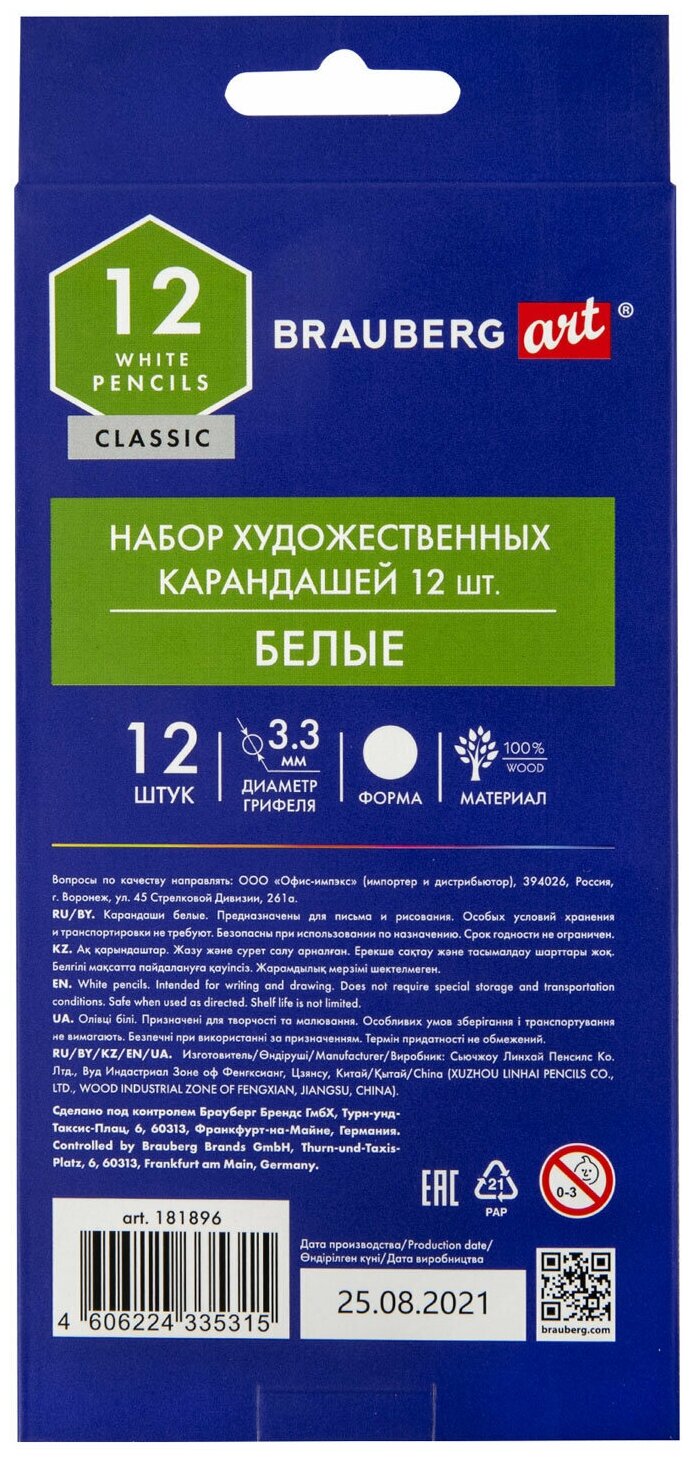 Купить Карандаши белые художественные классические для рисования, Набор 12 штук Brauberg Art Classic, Мягкий грифель 3,3 мм