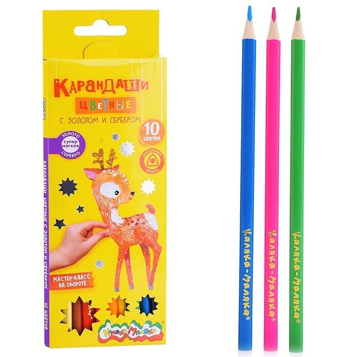 Купить Набор цветных карандашей Каляка-Маляка 10 цветов, трехгранные, золото и серебро (КТЗСКМ10)