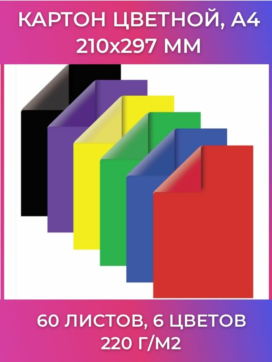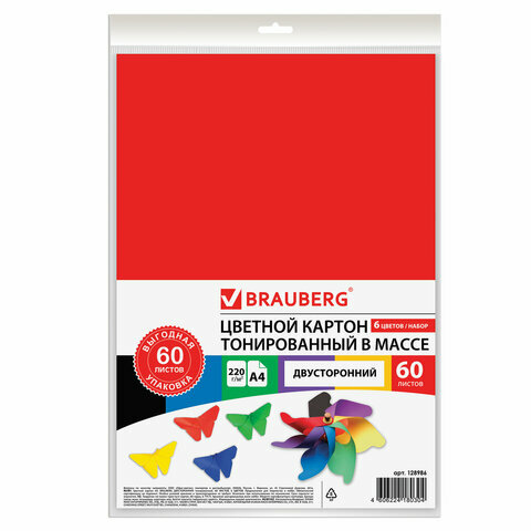 Картон цветной А4 тонированный В массе, 60 листов, 6 цветов, 220 г/м2, BRAUBERG, 210х297 мм, 128986