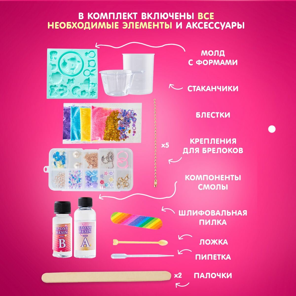 | Комплектация | мягкий молд с формами, стаканчики, чтобы смешивать смолу, 2 компонента эпоксидного состава, шлифовальную пилку, щипцы, палочки, фурнитуру, красители и блестки |