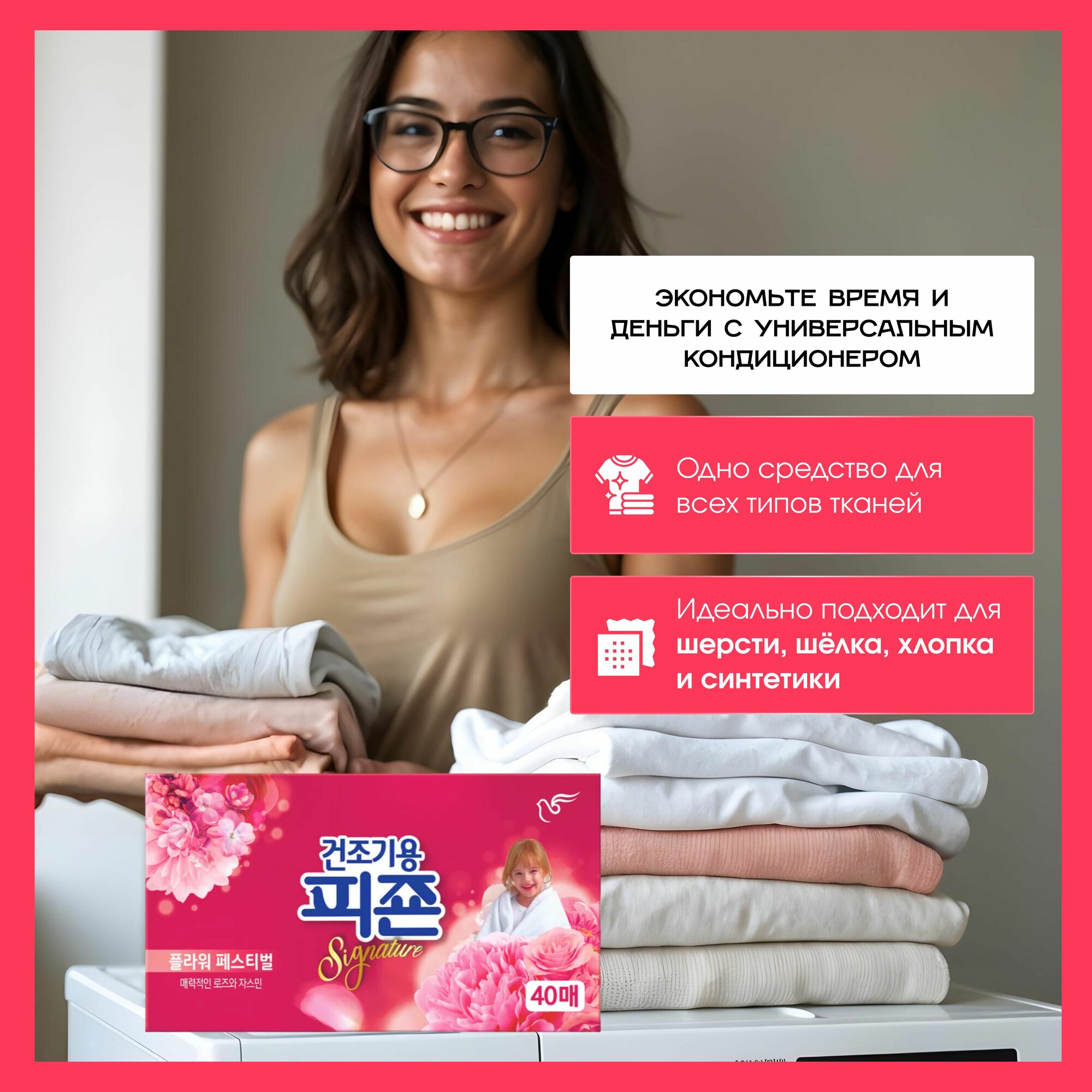 | Способ применения | Положить 1 салфетку в барабан сушильной машины или автоматической стиральной машины во время цикла сушки белья, 1 лист на 5 кг белья. После стирки использованную салфетку можно положить в шкаф или вложить в одежду в качестве ароматизатора для белья. |