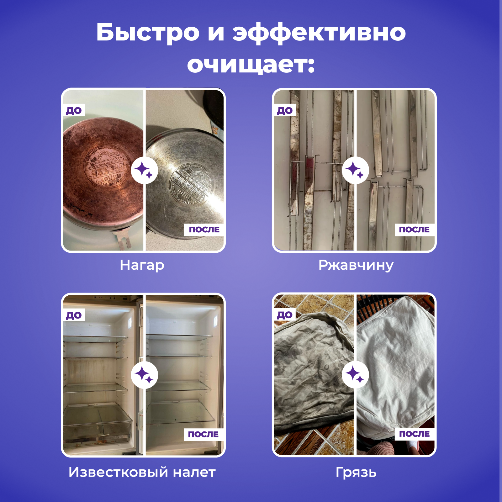 | Эффект | антибактериальный / выведение пятен / защита от плесени / обезжиривание / от запаха домашних животных / отбеливание / придание блеска / противоаллергенный / удаление накипи / устранение засоров / устранение застарелого жира / устранение нагара / устранение накипи / устранение неприятных запахов / устранение плесени / устранение ржавчины |
