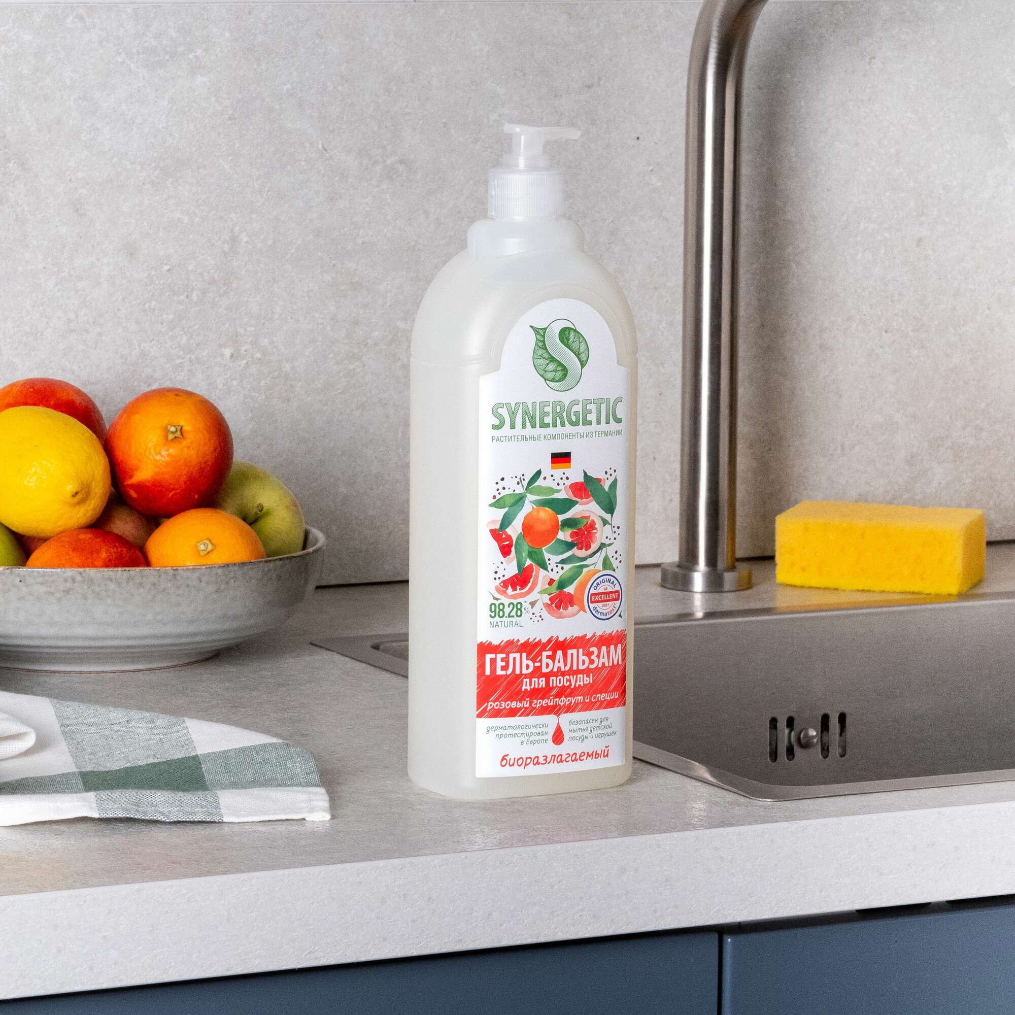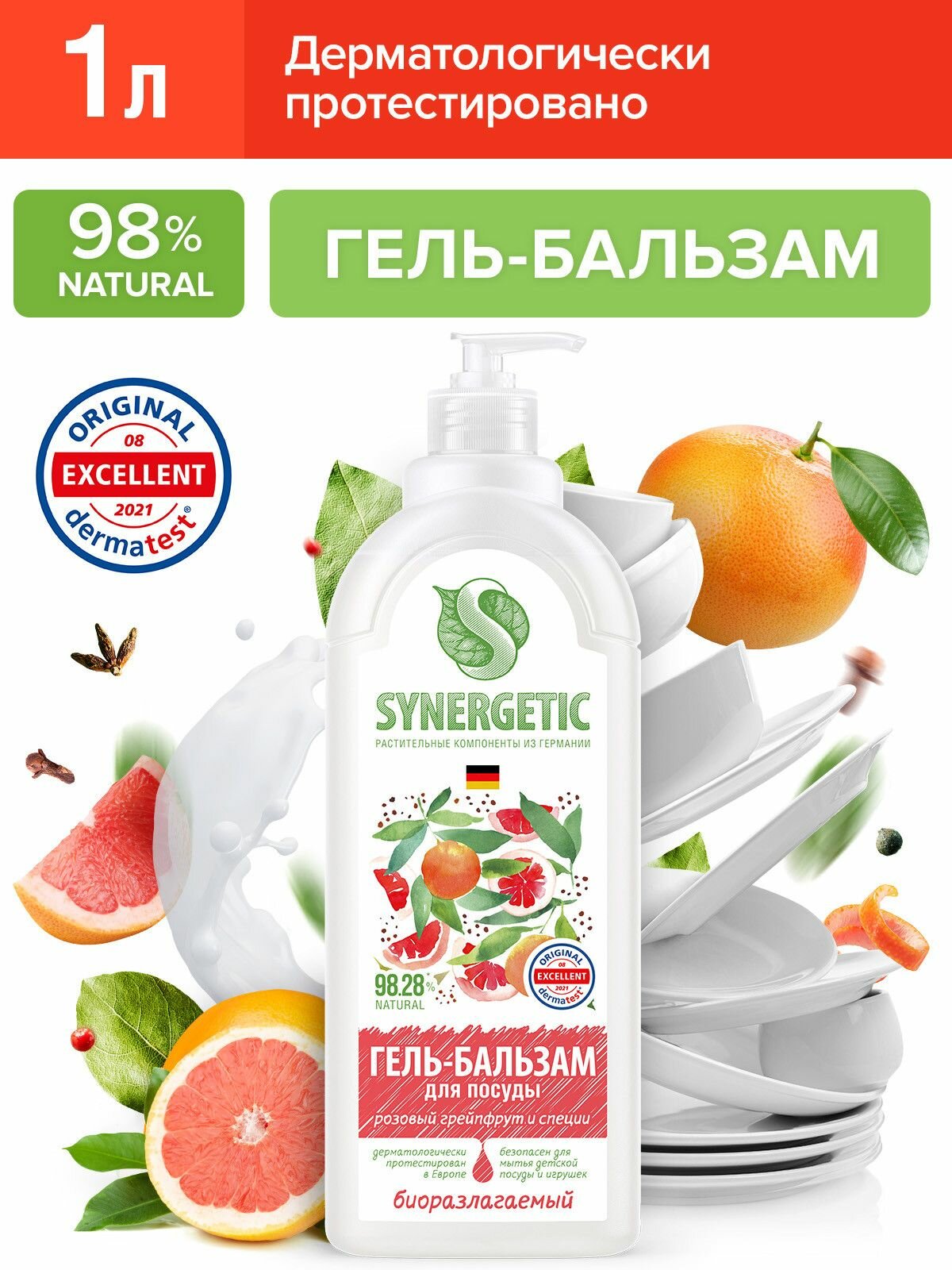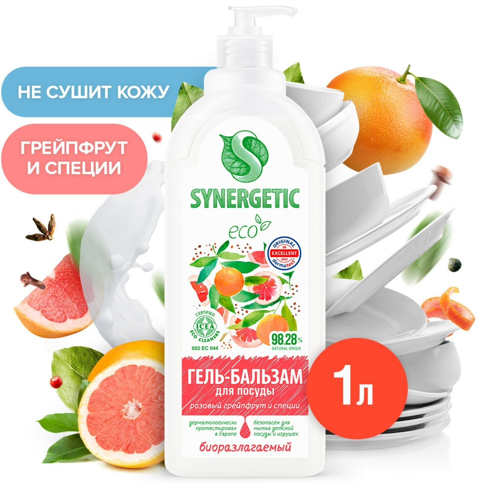 Гель-бальзам для мытья посуды Synergetic Розовый Грейпфрут и специи, гипоаллергенный, 1 л