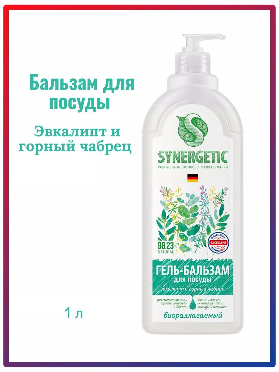 Купить Гель-бальзам для мытья посуды SYNERGETIC Эвкалипт и горный чабрец, биоразлагаемый 1л 4607971453666