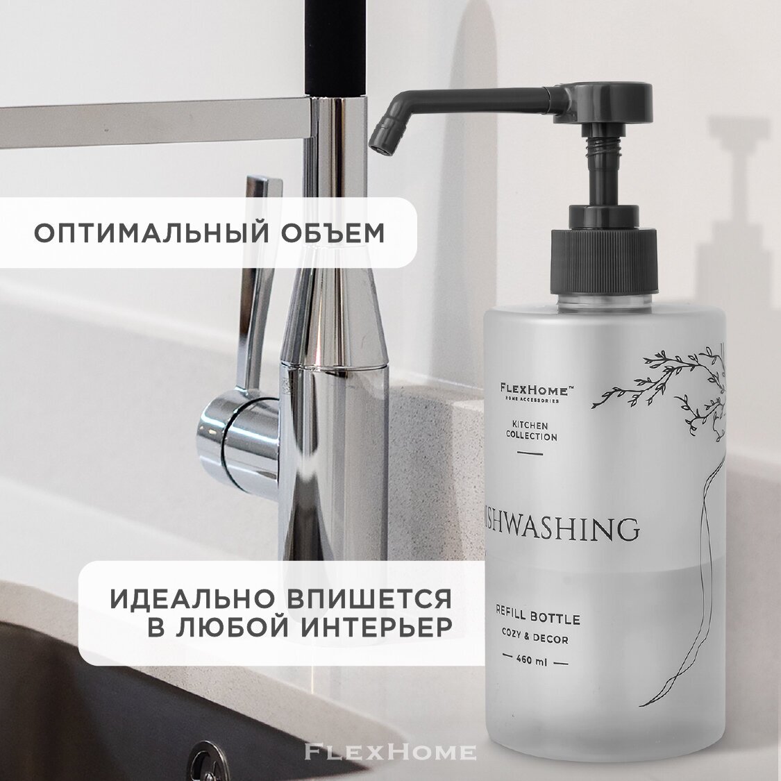 FlexHome Дозатор пластиковый для кухни под моющее средство, флакон 460 мл, белый интересное: