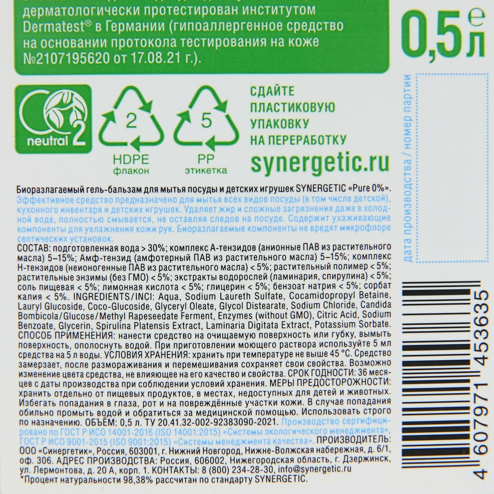 Гель-бальзам для посуды SYNERGETIC, PURE 0%, 500 мл интересное: