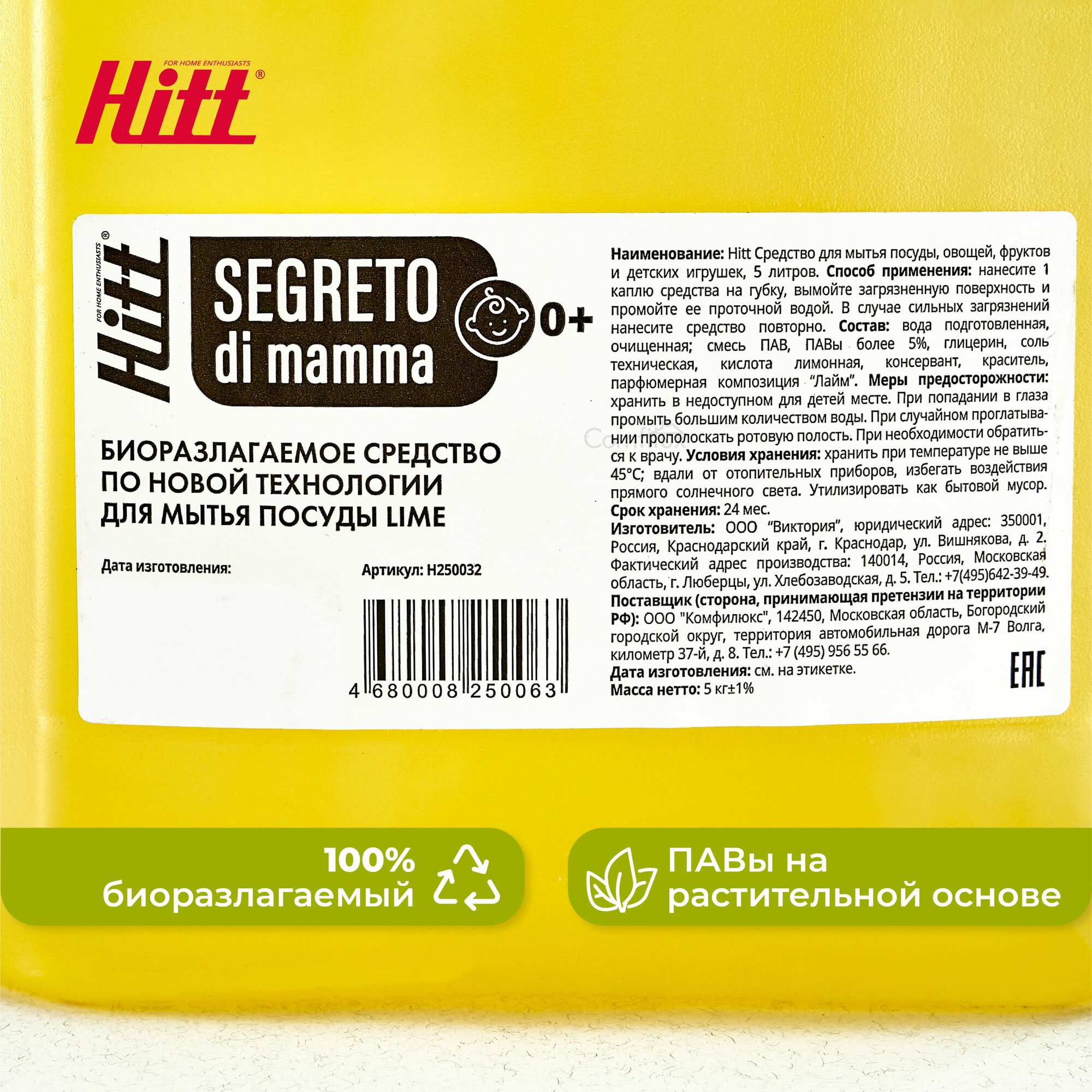 Купить Средство для мытья посуды Hitt Segreto Di Mamma для овощей и фруктов, детских игрушек, биоразлагаемое, лайм, 5 л