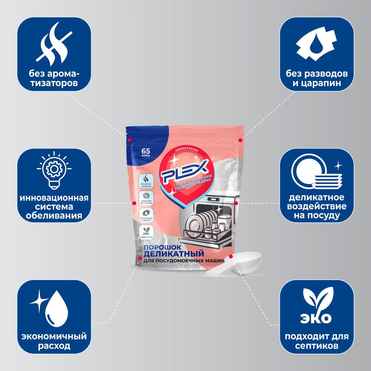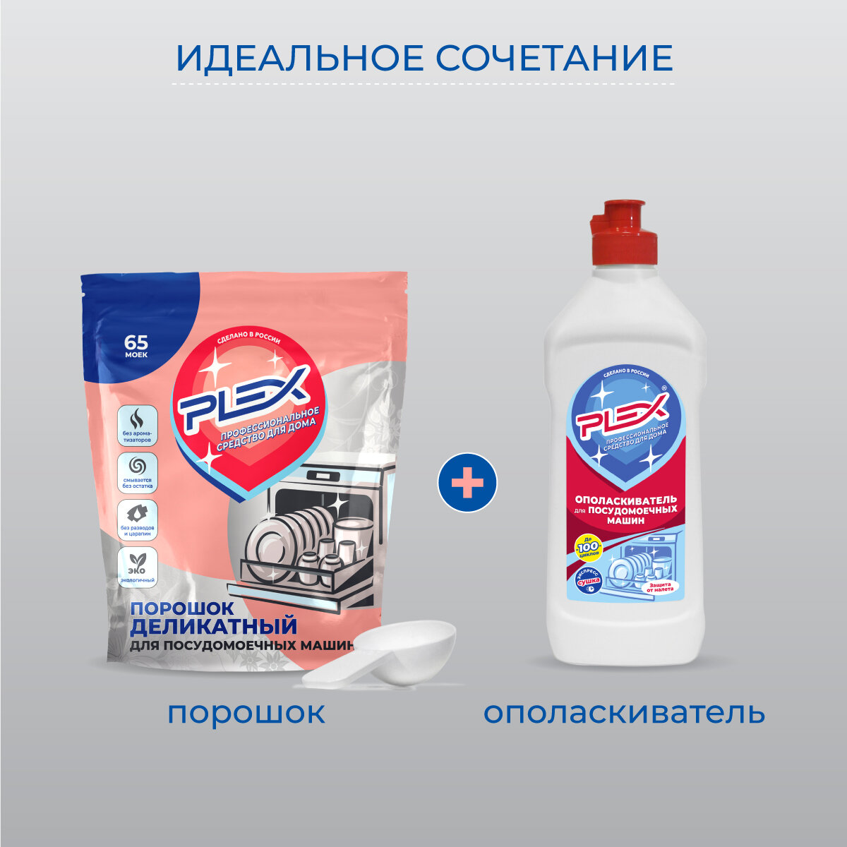 | Способ применения | Предварительно очистите посуду от остатков еды. Заполните специальный отсек посудомоечной машины рекомендуемым количеством порошка. Используйте специальную соль и ополаскиватель PLEX для вашей посудомоечной машины. |
