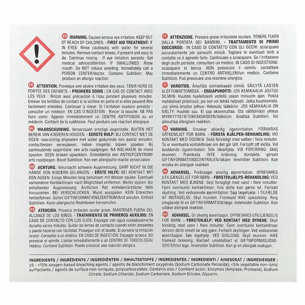 | Состав | Натрий перкарбонат (5-15%), Натрий цитрат (5-15%), Натрий силикат (5-15%), Натрий карбонат (5-15%), Глицерин (<5%), растительный неионогенный ПАВ (<5%), энзимы (<5%), натрий хлорид. |