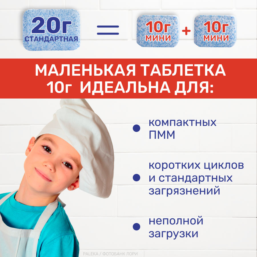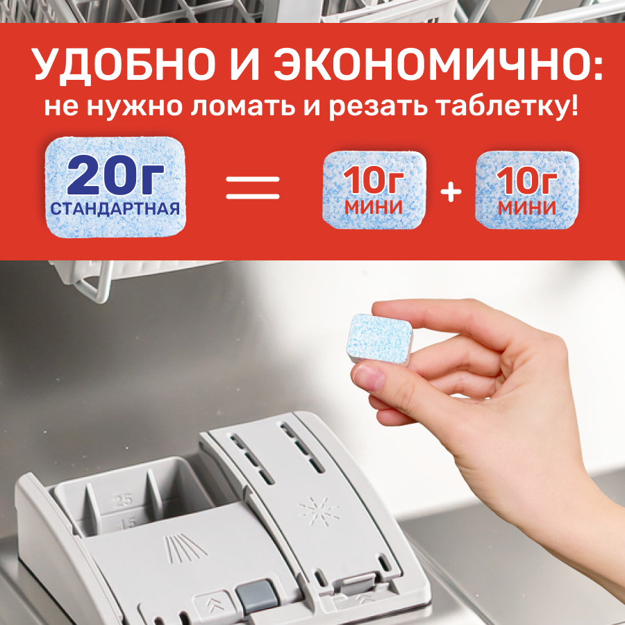 | Способ применения | Снимите защитную плёнку, положите таблетку в отсек для моющих средств. Закройте отсек, выберите программу, запустите посудомоечную машину. Мини таблетки предназначены для компактных ПММ, а также для неполной загрузки ПММ. |