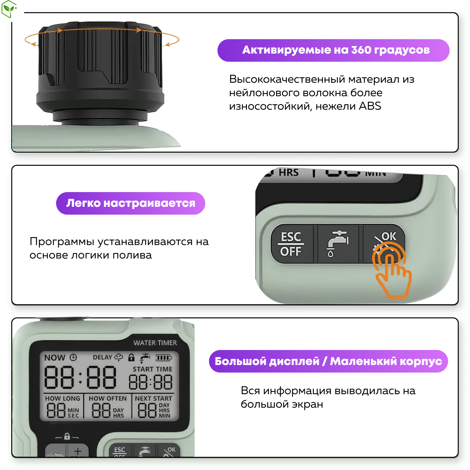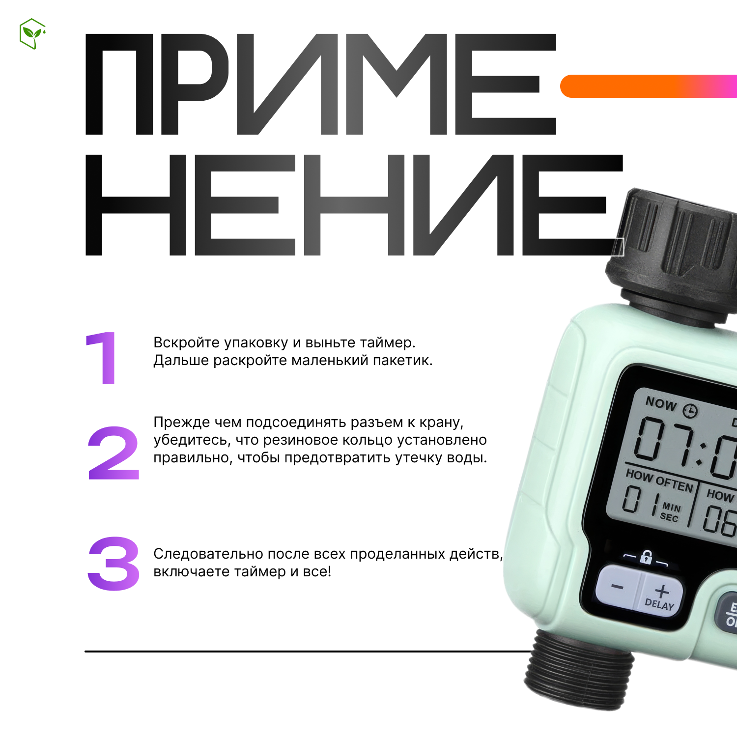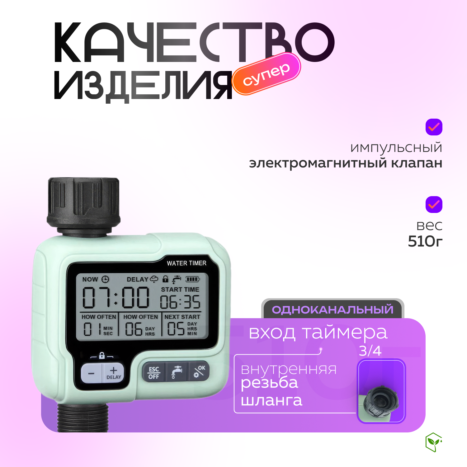 | Комплектация | Таймер для автоматического полива растений - 1 шт,Переходник 3/4-1/2 - 1 шт,Адаптер 3/4 - быстросъемное соединение - 1 шт, Инструкция по эксплуатации - 1 шт. |